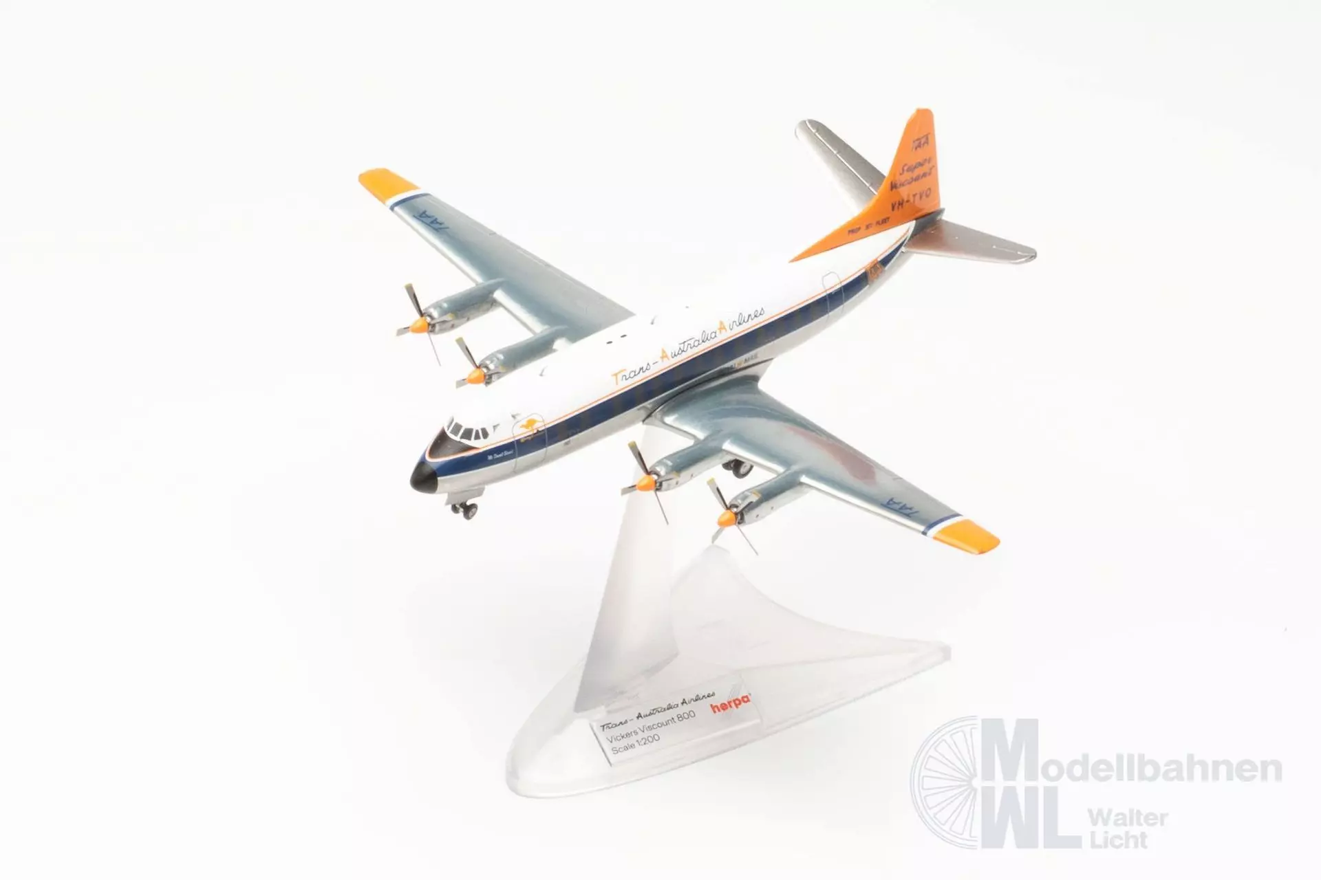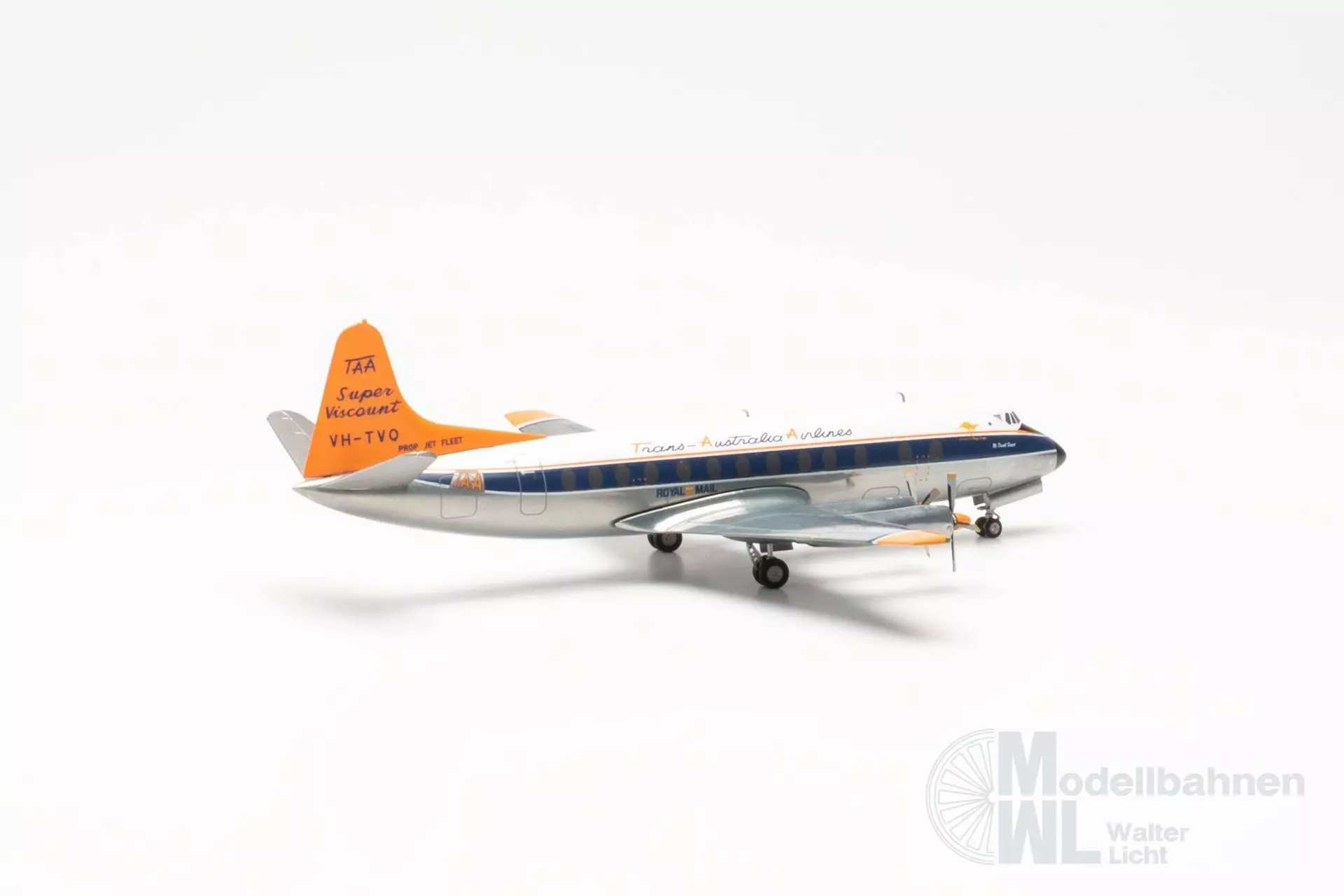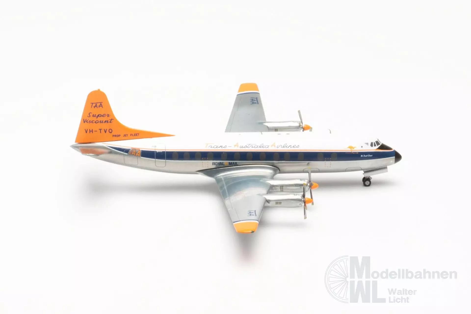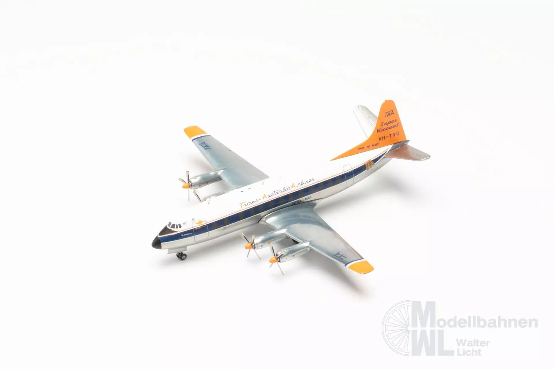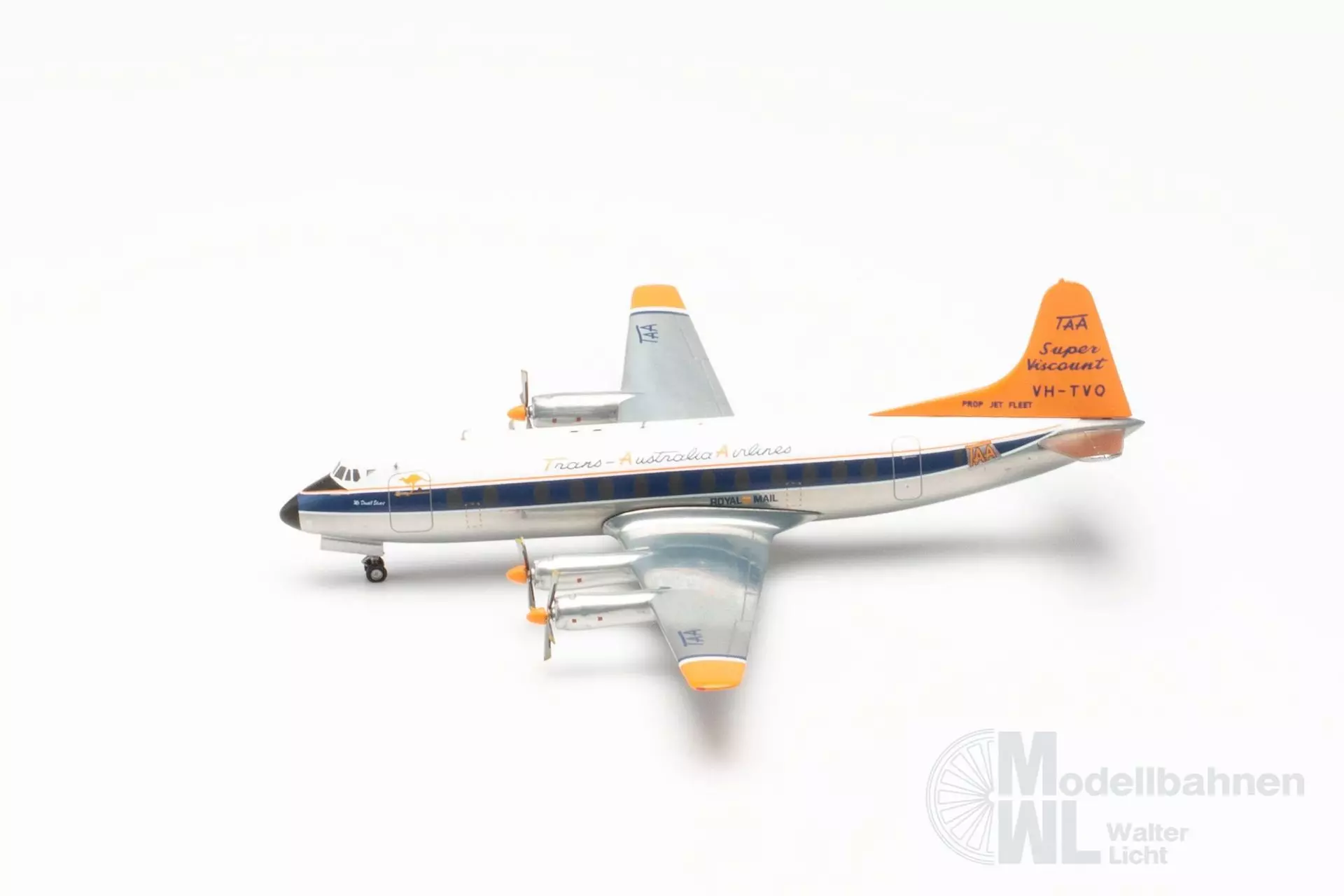In den späten 1950er Jahren führte TAA eine neue Bemalung ein, bei der das Heck ihrer Flugzeuge in Leuchtorange lackiert wurden. Die Leuchtfarbe wurde mit dem Ziel eingeführt, die Flugzeuge leichter am Himmel erkennbar zu machen, um somit die Sicherheit zu erhöhen. Das bis dahin übliche polierte Aluminium neigt dazu, die Farben seiner Umgebung zu spiegeln, wodurch das Flugzeug schwieriger zu sichten war. Die Day-Glow-Bemalung wurde nur rund drei Jahre eingesetzt, da die Farbe dazu neigte, schnell zu verblassen und abzublättern. Dennoch wurde die Farbgebung zu einem Erkennungszeichen der TAA bis heute. Maßstab: 1:200