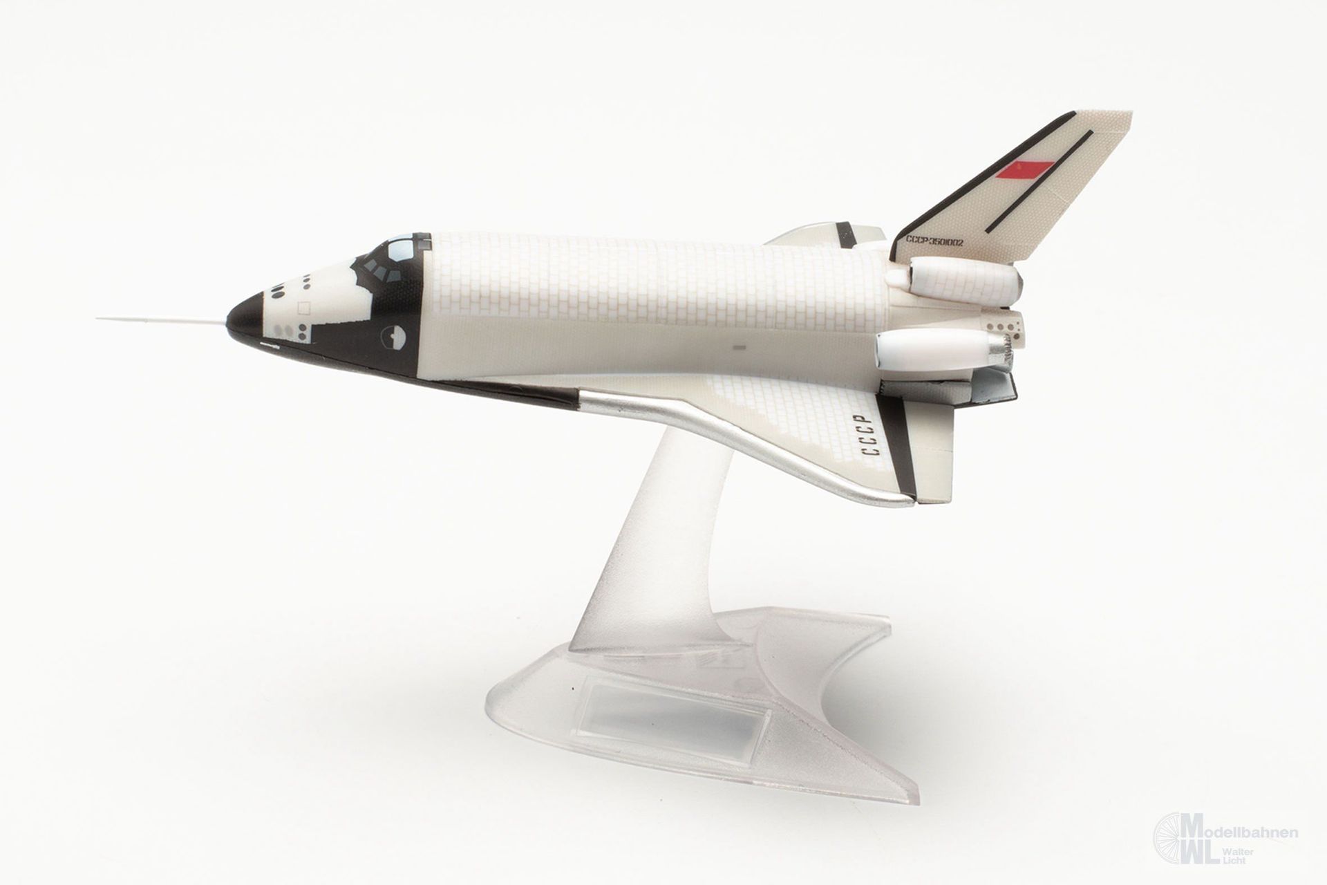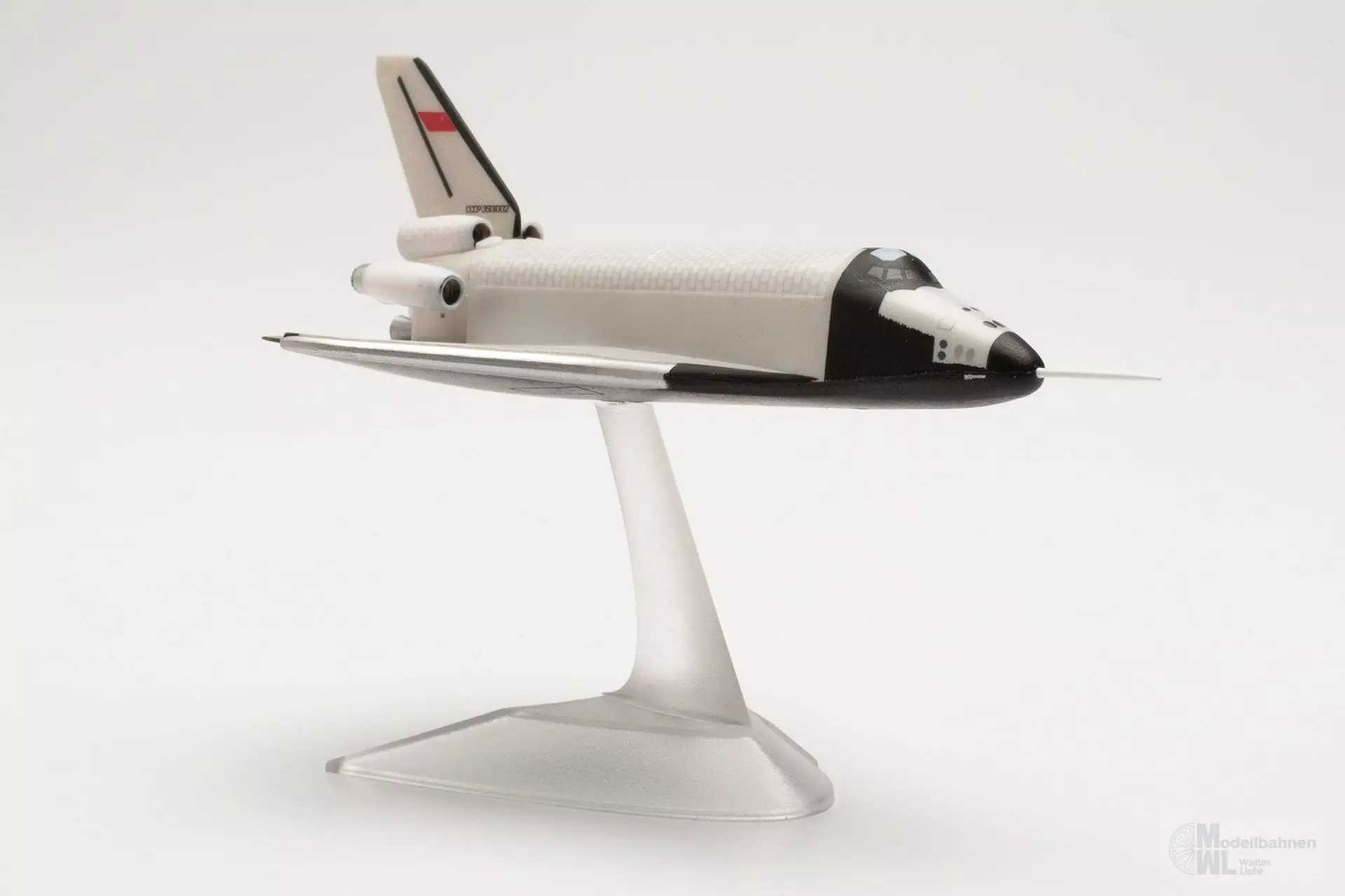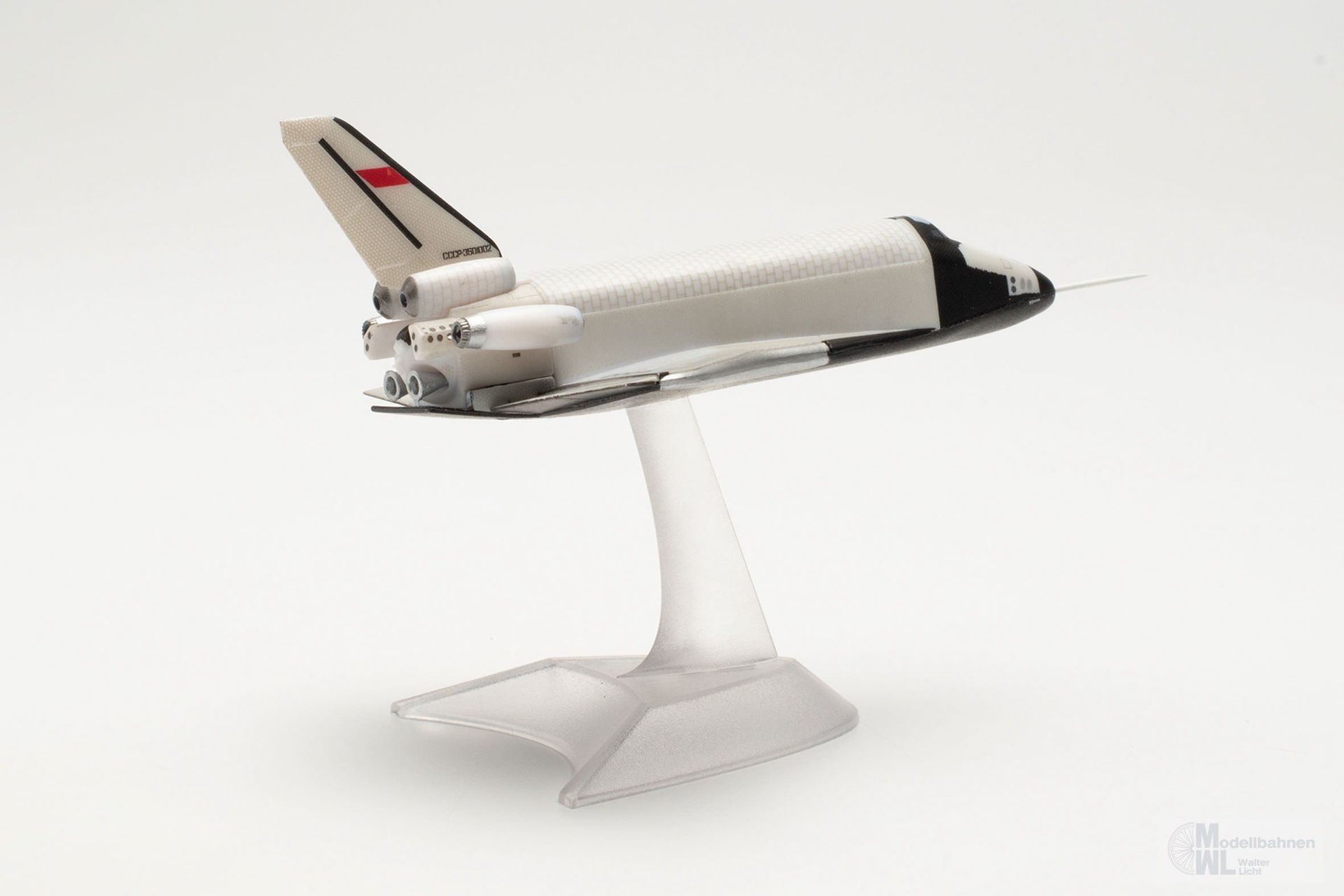 Eines der spektakulärsten Ausstellungsstücke des an Highlights ohnehin nicht armen Technik-Museums in Speyer am Rhein ist das Original dieses Prototyps des sowjetischen Raumtransporters Buran OK-GLI. In einer der Raumfahrt gewidmeten Halle befindet sich der 36 m lange und rund 80 Tonnen schwere Raumgleiter, der von 1984 bis 1989 25 Atmosphärenflüge durchgeführt hat. Angetrieben wurde das Erprobungsflugzeug von vier Strahltriebwerken am Heck, mit denen es im Gegensatz zum ähnlich aussehenden Space Shuttle der NASA eigenständig starten und landen konnte. Das Modell dieses legendären Raumtransporters im Maßstab 1:400 wird ohne Fahrwerk mit einem Display-Stand geliefert.
