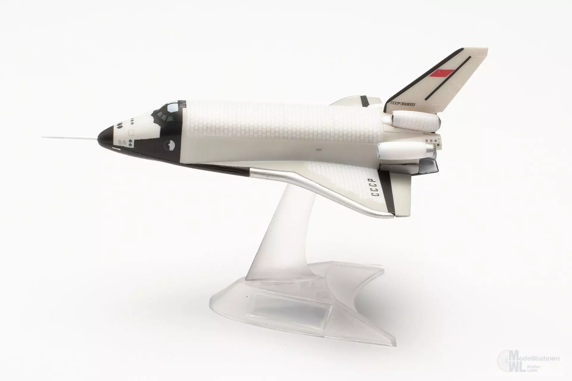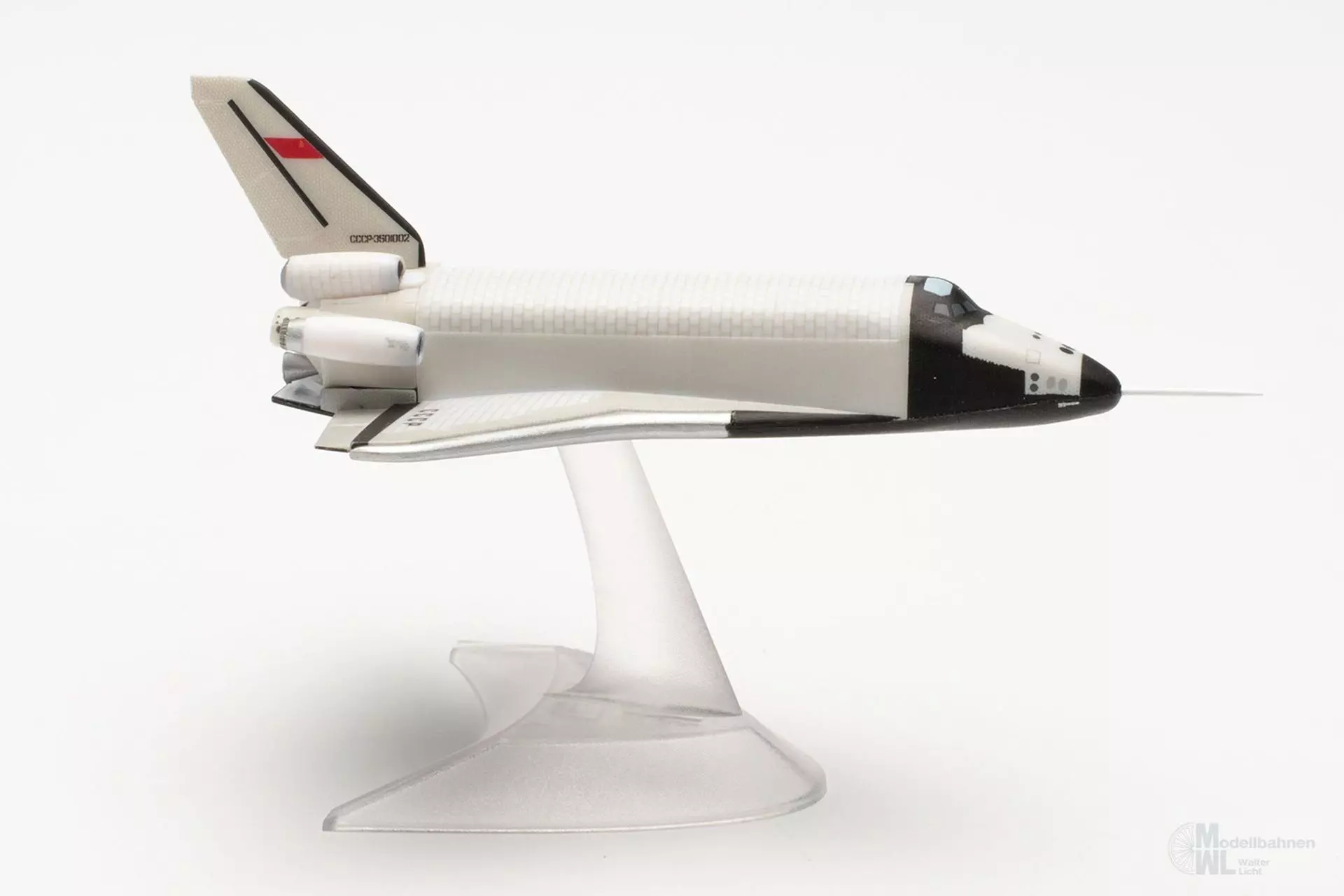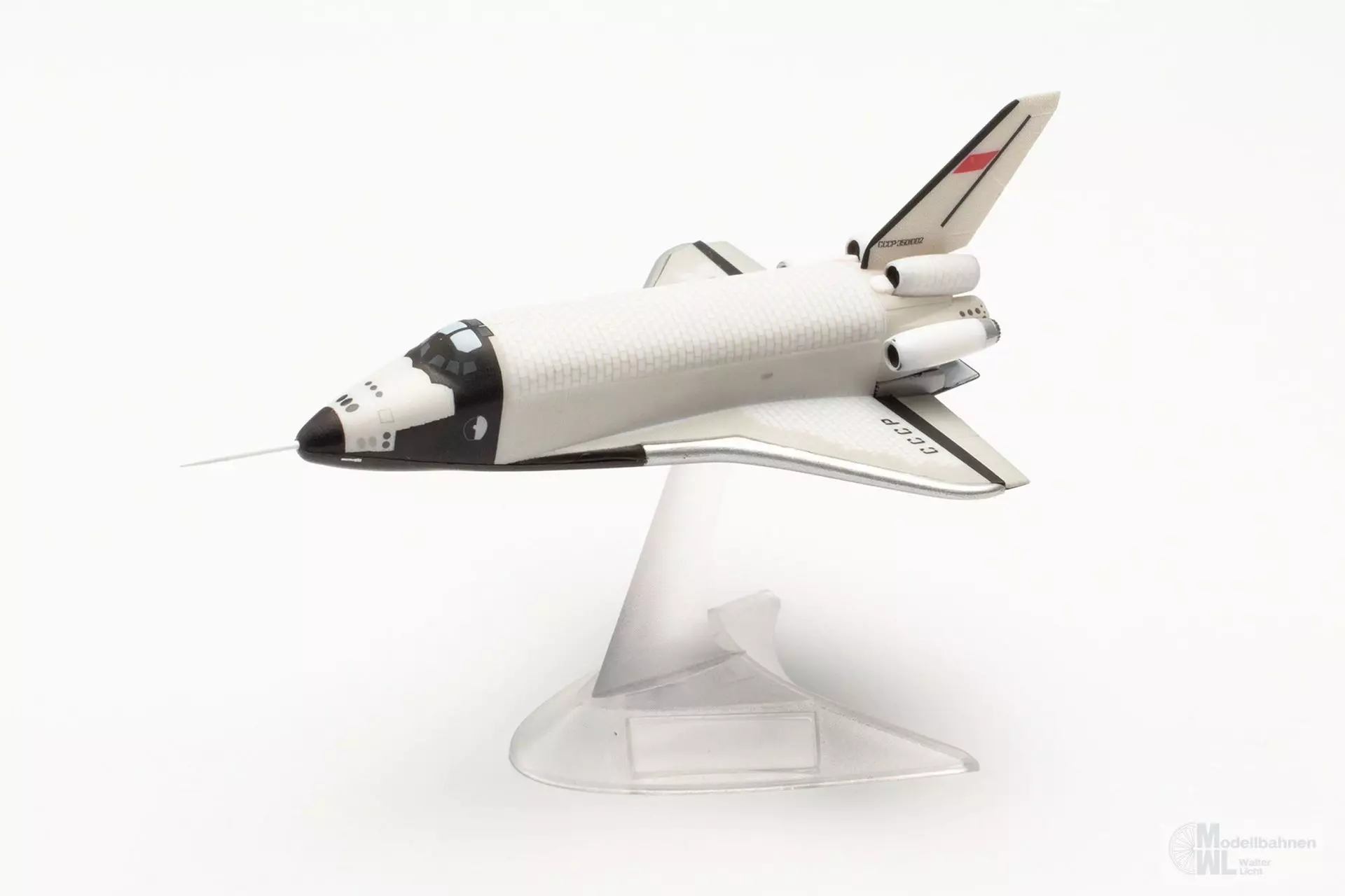 Eines der spektakulärsten Ausstellungsstücke des an Highlights ohnehin nicht armen Technik-Museums in Speyer am Rhein ist das Original dieses Prototyps des sowjetischen Raumtransporters Buran OK-GLI. In einer der Raumfahrt gewidmeten Halle befindet sich der 36 m lange und rund 80 Tonnen schwere Raumgleiter, der von 1984 bis 1989 25 Atmosphärenflüge durchgeführt hat. Angetrieben wurde das Erprobungsflugzeug von vier Strahltriebwerken am Heck, mit denen es im Gegensatz zum ähnlich aussehenden Space Shuttle der NASA eigenständig starten und landen konnte. Das Modell dieses legendären Raumtransporters im Maßstab 1:400 wird ohne Fahrwerk mit einem Display-Stand geliefert.