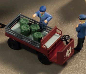 Bausatz. Der Elektrokarren, nach einem Vorbild von Balkancar, ist in Rotbraun und Grau gehalten Die Gitterbordwand dient dem sicheren Transport der vier beiliegenden Essenkübel.