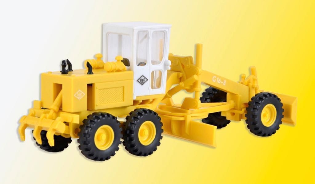 Bausatz. Vorbilddaten: O&K Grader 16-8 m, 140 kW/190 PS, Gewicht ca. 14 t, Scharbreite 4 m. Der Grader wird für Erdbewegungen, Straßenbau und -instandhaltung eingesetzt. Er zeichnet sich durch seine überlegene Technik und Robustheit aus. Standard- und Zusatzausrüstung gewährleisten vielfältige Einsatzmöglichkeiten. Durch die Schwenkarmkinematik des Hauptschildes können Böschungswinkel bis 90° angelegt werden. Mit Stirnschild und Dreizahnaufreißer ergibt sich eine Gesamtlänge von 9,1 m. Das Gerät ist jedoch dank Servolenkung, Servobremse und exakt ansprechender Steuerventile leicht zu handhaben. Maße: L 10,5 x B 3 x H 3,8 cm. Schwierigkeitsgrad: 2 (Fortgeschrittene).