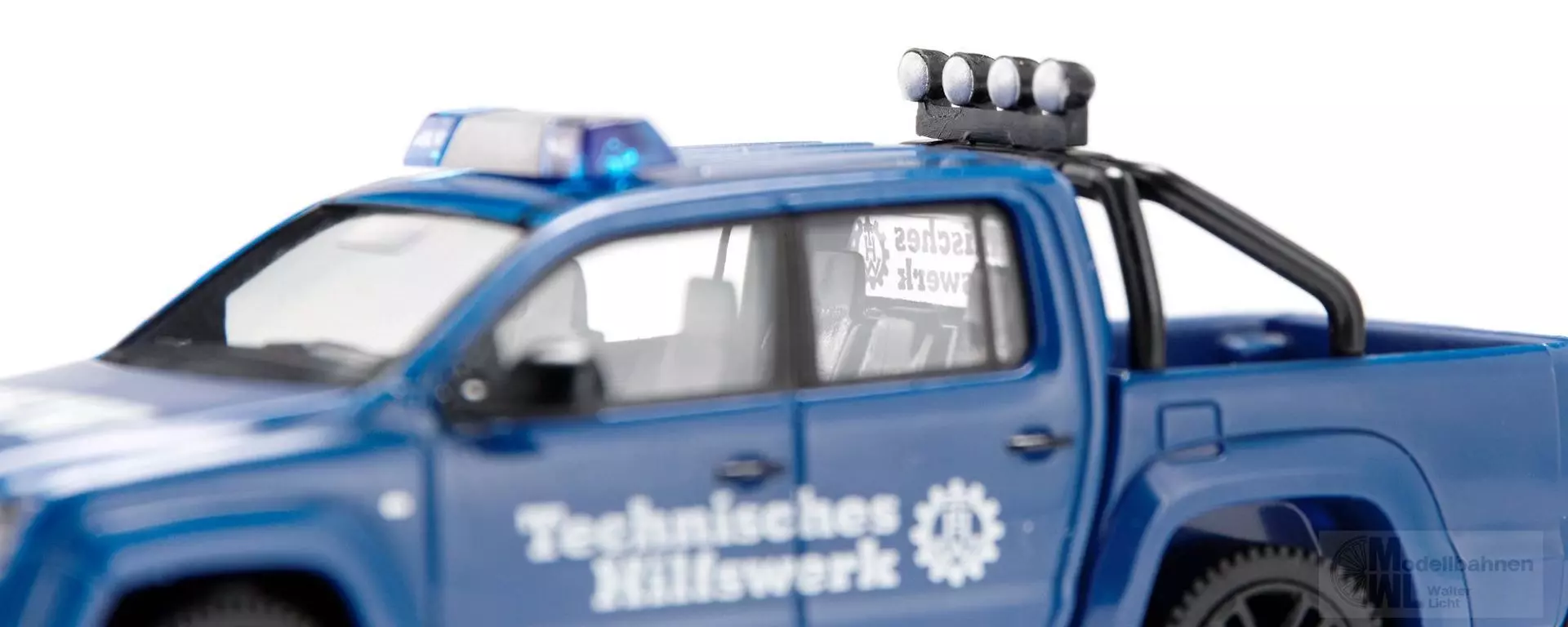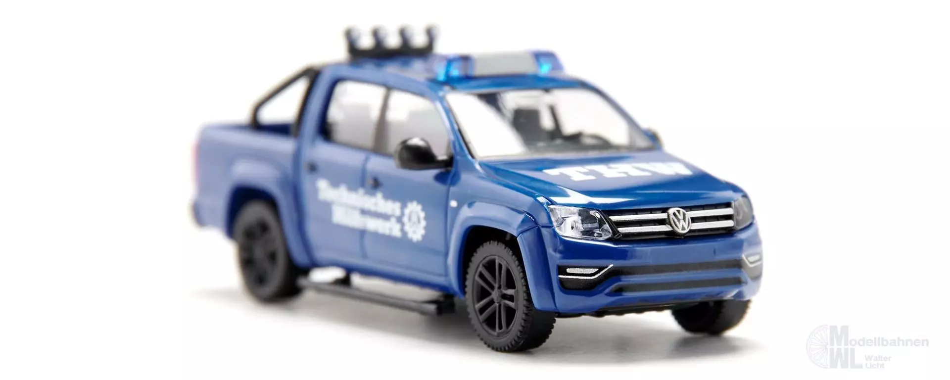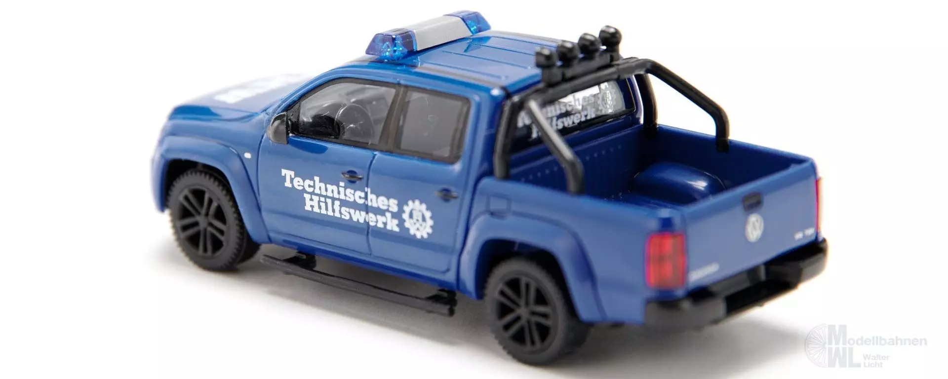 Der Amarok besitzt beim THW einen guten Ruf Der Amarok der ersten Generation hat sich einen guten Ruf erworben und ist inzwischen bei zahlreichen Ortsverbänden des Technischen Hilfswerks zu finden. Die einsatztypische Pritschenversion mit Überrollbügel hat WIKING diesmal miniaturisiert – die Geschichte des Amarok geht weiter. Die Resonanz auf den Allradler ist überall positiv. Das liegt vor allem an den Vorteilen eines typischen Pick-ups mit Doppelkabine. Denn der geländetaugliche Amarok kann sowohl Einsatzkräfte als auch erstes Hilfsgerät oder Versorgungsgüter mit zur Einsatzstelle bringen. Dementsprechend rüstete WIKING die 1:87-Miniatur mit aktuellem Leuchtbalken aus. Karosserie von Fahrerhaus und Pritsche in ultramarinblau, Fahrgestell, Seitenspiegel und Kühlergrill in schwarz. Inneneinrichtung mit Sitzen und Armaturenbrett in schwarz. Überrollbügel ebenfalls schwarz. Frontscheinwerfer transparent, Heckscheinwerfer rottransparent eingesetzt. Felgen in schwarz. Heckstoßstange schwarz. Heckseitig dritte Bremsleuchte in rot aufgedruckt, außerdem VW-Logo. Kühlergrill mit silbernen Zierleisten und VW-Logo. Verglasung vorne und hinten mit schwarzer Scheibenumrandung. Seitliche Scheibenbegrenzung sowie B-Holme und hintere Scheibenabtrennung in schwarz. Blaulichtbalken blautransparent eingesteckt. Motorhaube mit Logo „THW“, Türbedruckung mit Hinweis auf Technisches Hilfswerk in Schriftzug und Logo, heckseitige Verglasung ebenfalls.