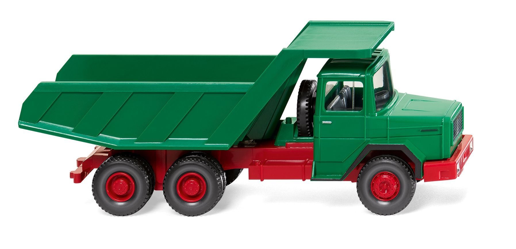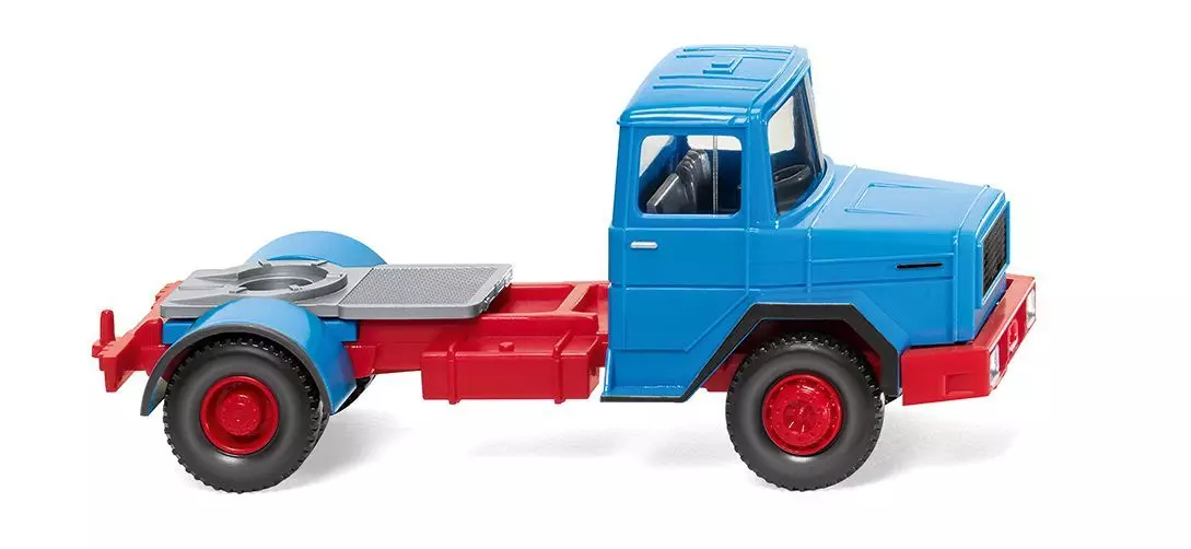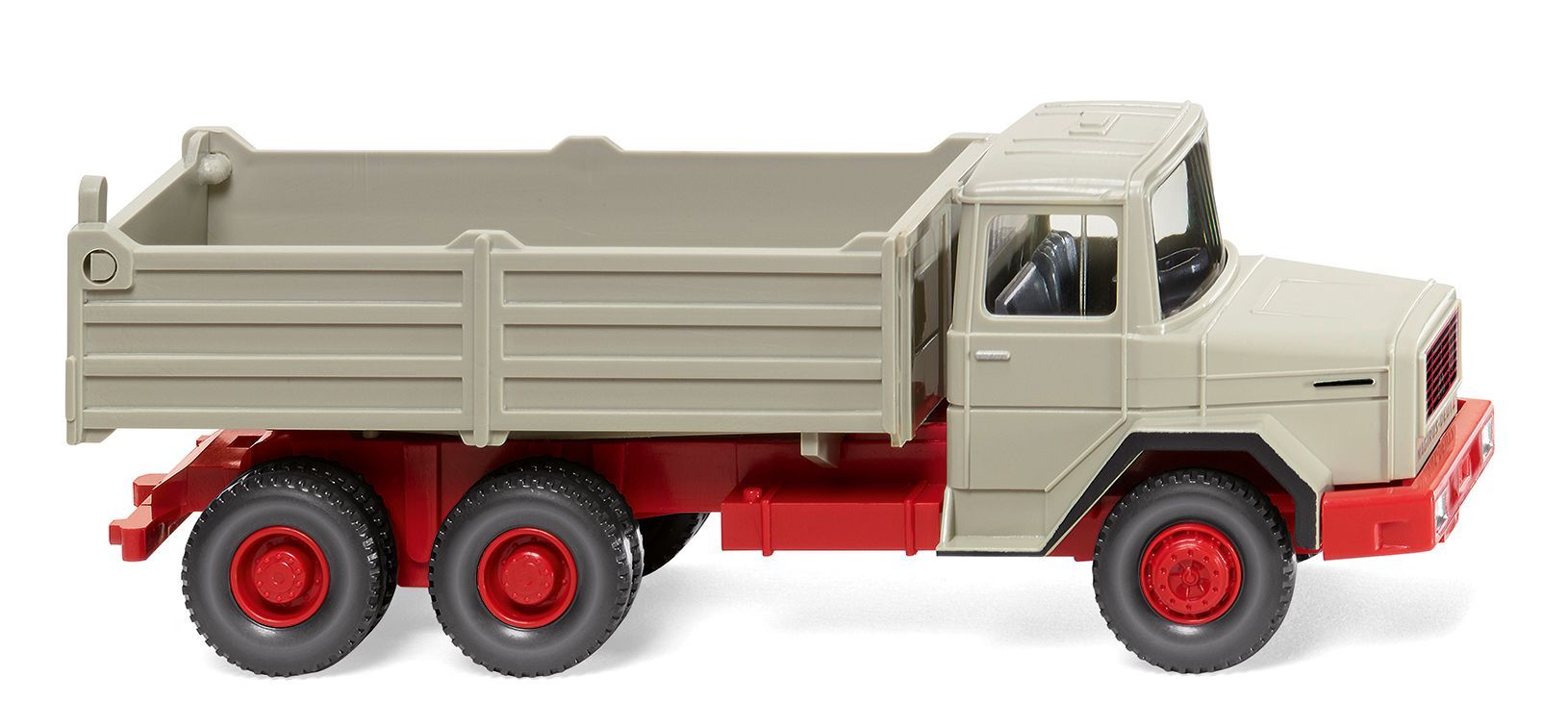Die großartigen „Heuler“ mit der eckigen Haube Vor rund 50 Jahren erstaunte Magirus Deutz die Fachwelt mit einer neuen Haubenwagengeneration. Zwar schien die Zeit für Haubenwagen auszulaufen, doch gerade im Baubereich etablierten sich die neue Ulmer Lkw-Generation als robuste Alleskönner. Industriedesigner Louis Lepoix hatte für Magirus die Karosseriehülle der Haube entworfen. Gerade auf der Baustelle hatten sich die Ulmer Lkw einen tadellosen Ruf erworben – auch dank der luftgekühlten Deutz-Motoren, die bei vielen Bauunternehmen lange Zeit als alternativlos galt. „Die deutschen Bullen. Mit Kraft und Fortschritt“, so warben die Lkw-Bauer 1970 und waren damals sogar beim Bau des Münchener Olympiastadiums eingebunden. Später übernehmen sie sogar das Trikotsponsoring beim FC Bayern München. Die „Baubullen“ von Magirus Deutz waren insgesamt fast 30 Jahre lang in Produktion. Hunderte der Magirus Muldenkipper mit Deutz-Motor waren damals dabei, als die Baikal-Amur-Magistrale entstand. Die Luftkühler konnten den niedrigsten Temperaturen widerstehen – mehr Würdigung für die Verlässlichkeit der „Deutschen Bullen“ konnte es nicht geben. WIKING baute schon in den siebziger Jahren die letzte Eckhauber-Generation mit legendärer Meiller-Mulde und Kipper. Inzwischen sind sie fester Bestandteil der Oldtimerszene und erfreuen sich dort wachsender Beliebtheit. Dabei wirken sie – auch 50 Jahre nach ihrem Erscheinen – noch immer progressiv. Kipper: Fahrerhaus mit Pritsche, Heckklappe und Haken kieselgrau, Fahrgestell mit Kardanteil und Felgen feuerrot. Inneneinrichtung basaltgrau. Kühlergrillfläche schwarz bedruckt mit gesilberten Logo und Schriftzug Magirus Deutz. Seitlich silberne Türgriffe sowie schwarzgraue Kotflügelaußen- und Tritt-kanten. Haltegriff schwarz. Rückleuchten karminrot. Scheinwerfer in der Frontstoßstange per Hand gesilbert. Heckseitig mit schwarz-silbernem Meiller-Schriftzug. Muldenkipper: Fahrerhaus mit Pritsche, Heckklappe und Haken minzgrün, Fahrgestell mit Kardanteil und Felgen karminrot. Inneneinrichtung basaltgrau. Kühlergrillfläche schwarz bedruckt mit gesilberten Logo und Schriftzug Magirus Deutz. Scheinwerfer in der Frontstoßstange per Hand gesilbert. Kotflügelaußen- und Trittkante sowie Haltegriff schwarz bedruckt. Rückleuchten rot bedruckt. Zugmaschine: Fahrerhaus himmelblau mit basaltgrauem Sitz und Lenkrad. Fahrgestell mit Anhängerkupplung und Kardanwelle sowie Kotflügel und Felgen karminrot. Hintere Kotflügel himmelblau. Kühlergrill schwarz bedruckt und mit silbernem Magirus-Logo sowie Schriftzug Magirus-Deutz silbern bedruckt. Seitlich silberne Türgriffe sowie schwarzgraue Kotflügelaußen- und Trittkanten. Haltegriff schwarz. Rückleuchten karminrot. Scheinwerfer in der Frontstoßstange per Hand gesilbert.