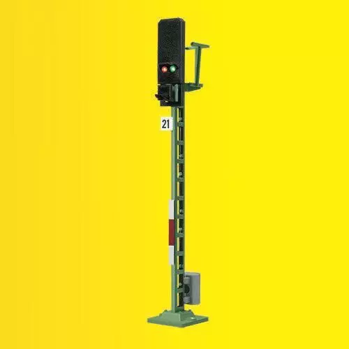 Signal der Einheitsbauart mit filigranem Messingmast in originalgetreuer Lackierung. Flexible Montage durch beiliegende Schrauben und Befestigungsclip für Teppichbahnen. Mit 2 LEDs, wartungsfrei. Signalbilder Hp0 und Hp1. Passendes Steuermodul: Art. 5221. Höhe: 15,5 cm.