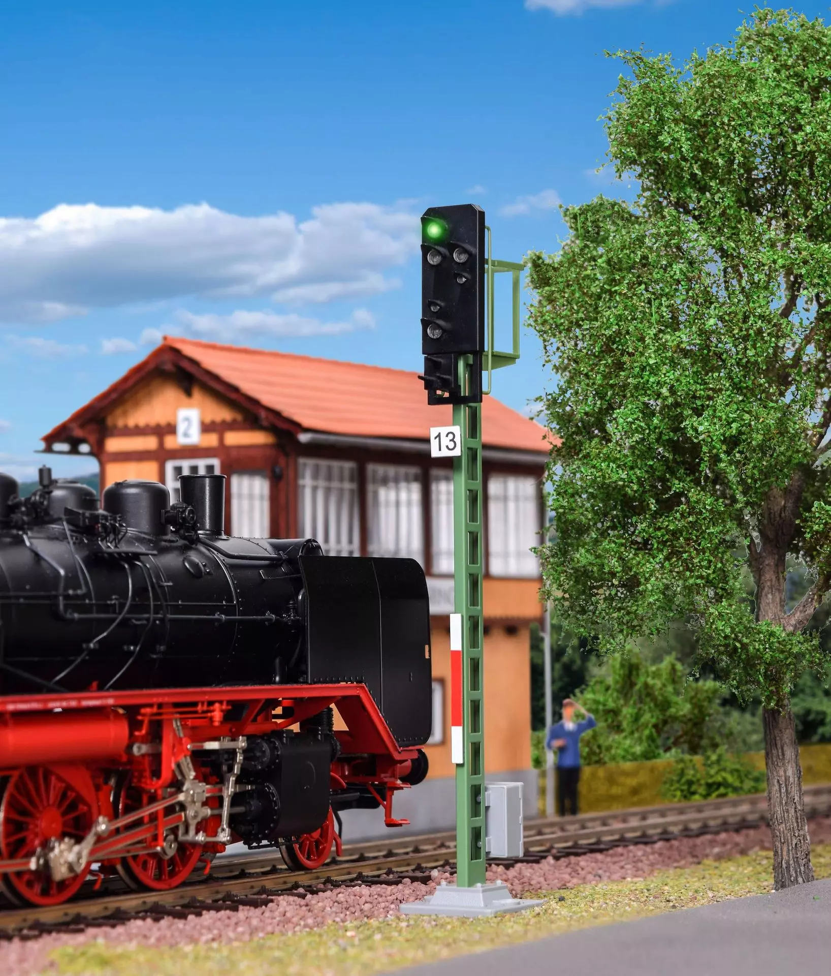 Signal der Einheitsbauart. Filigraner Messingmast in originalgetreuer Lackierung. Flexible Montage durch beiliegende Schrauben und Befestigungsclip für Teppichbahnen. Wartungsfrei dank LED-Beleuchtung. Mit 6 LEDs. Signalbilder Hp0, Hp0/Sh1, Hp1, Hp2. Passendes Steuermodul: Art. 5223. Höhe: 15,5 cm.