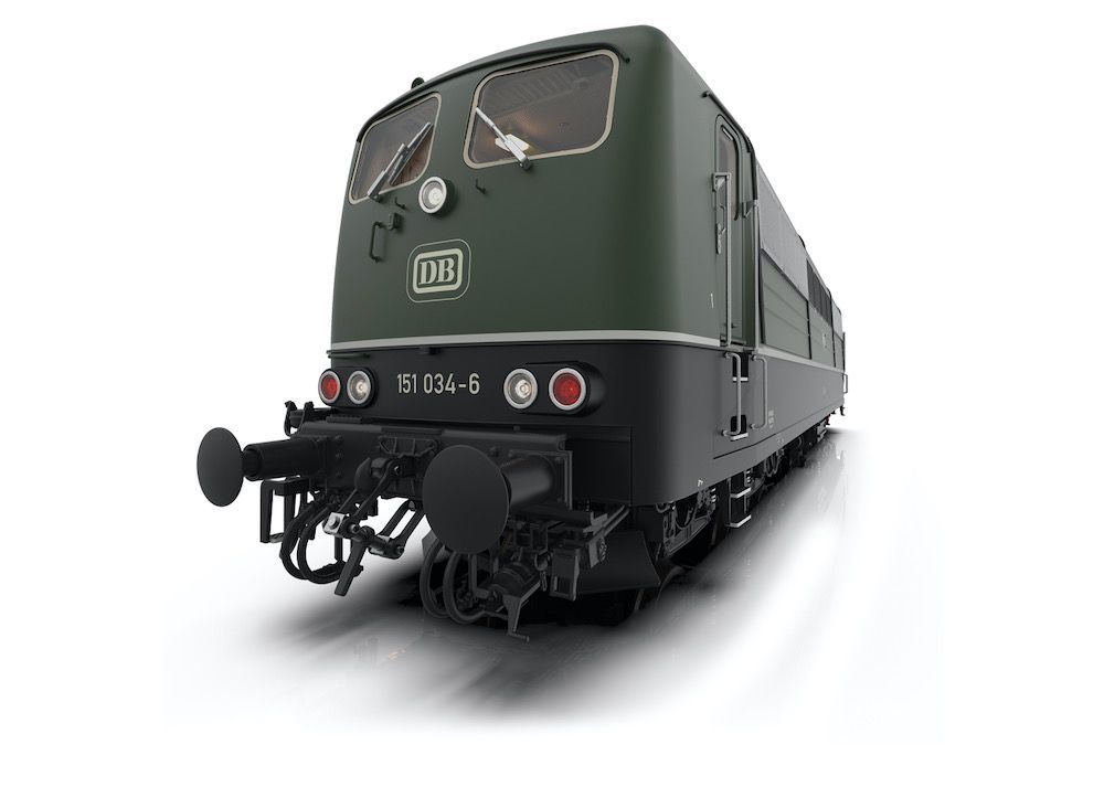 Vorbild: Schwere Güterzuglokomotive Baureihe 151 der Deutschen Bundesbahn (DB). Chromoxydgrüne Farbgebung.Betriebsnummer 151 034-6. Betriebszustand der EP. IV um 1975/1976.