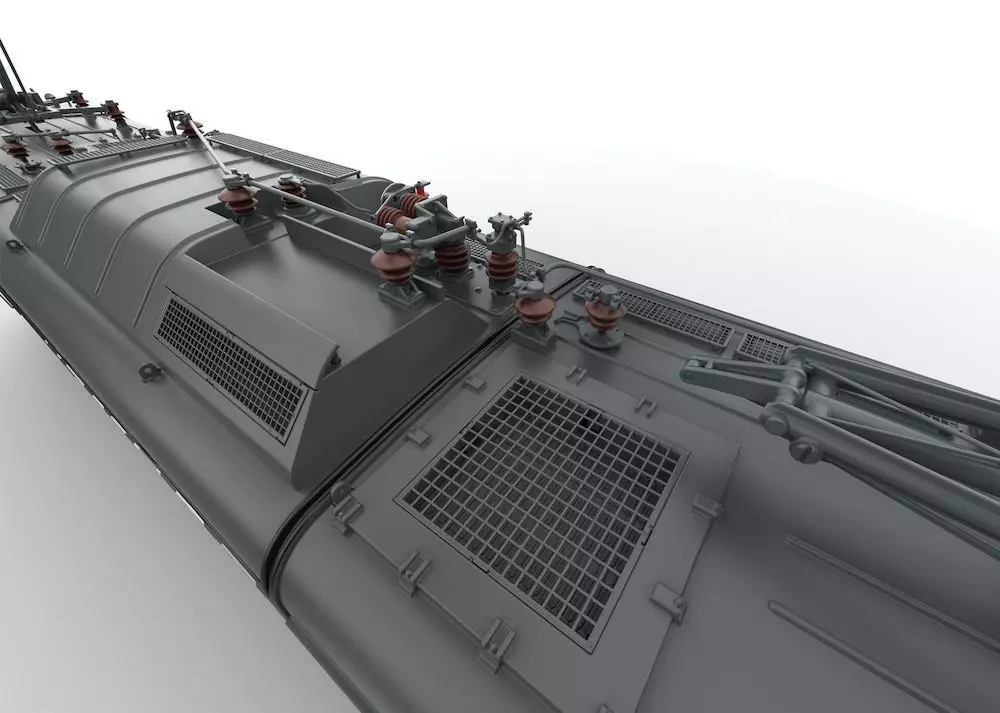 Komplette hochdetaillierte Neuentwicklung aus Zinkdruckguss mit angesetzten Messing-Schleudergussteilen.Hochdetailliertes Profimodell.Im Digitalbetrieb motorisch heb- und senkbare Dachstromabnehmer.Digital schaltbare Telex-Kupplung vorne und hinten.Äußerst umfangreiche Soundausstattung.Fahrpultbeleuchtung.Strompuffer.Schraubenkupplungen für vorn und hinten im Lieferumfang.