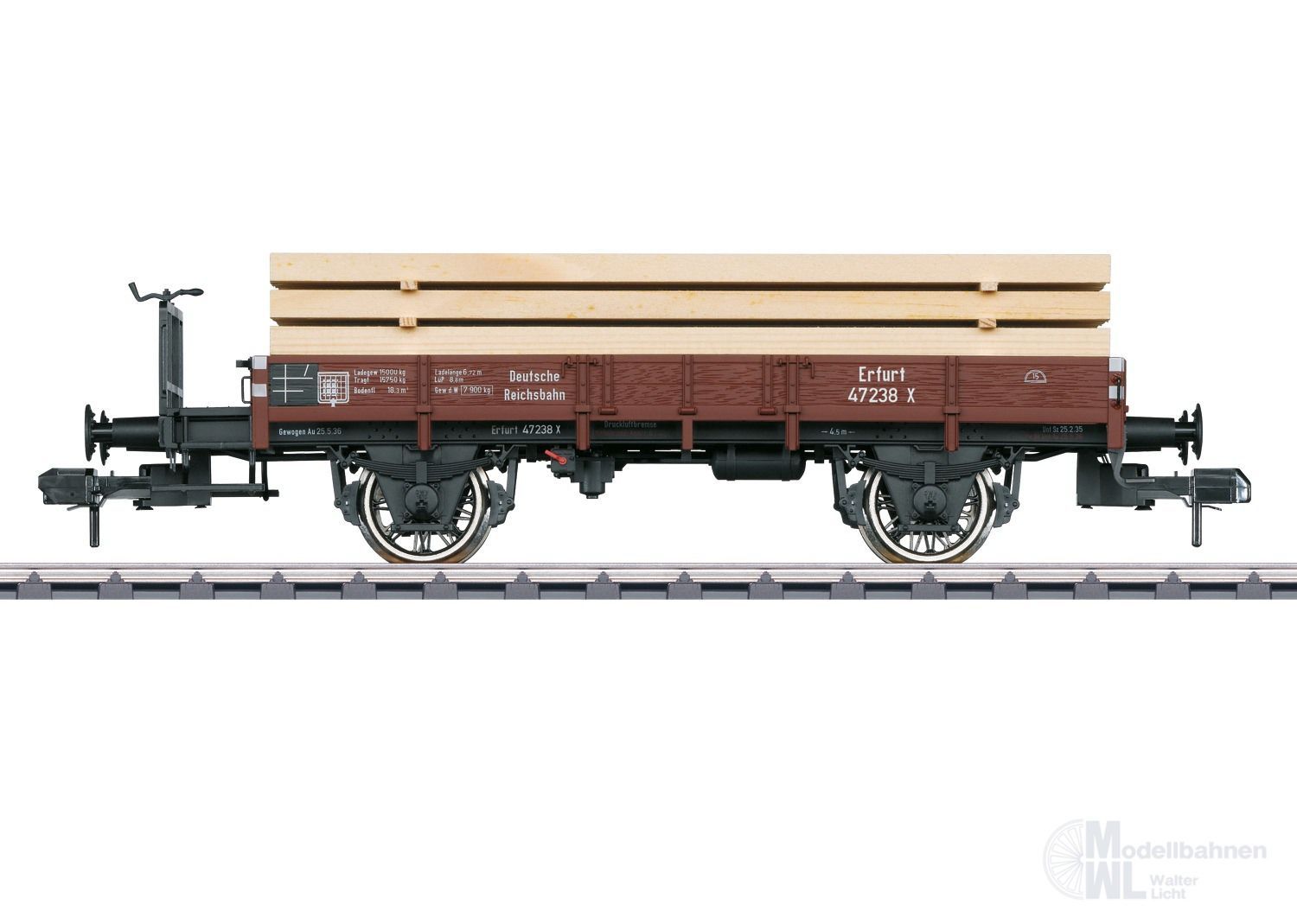 Vorbild: Niederbordwagen mit Bremserbühne Typ X Erfurt mit Ladegut Balkenstapel, der Deutschen Reichsbahn Gesellschaft (DRG). Wagennummer 47238.
