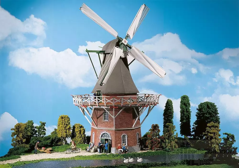 in typisch niederländischer Bauweise, mit gemauertem Unterbau. Ohne Motor. Durch Aufspannen der Windsegel ist Windbetrieb möglich. Motor (Art. 330090) ist nachrüstbar.