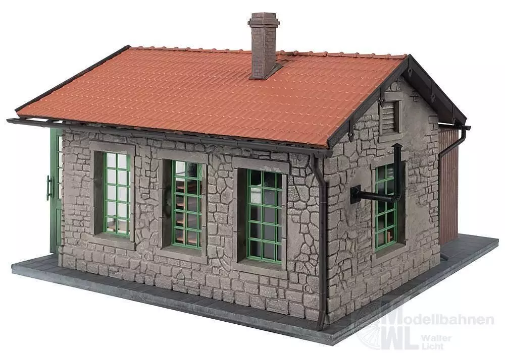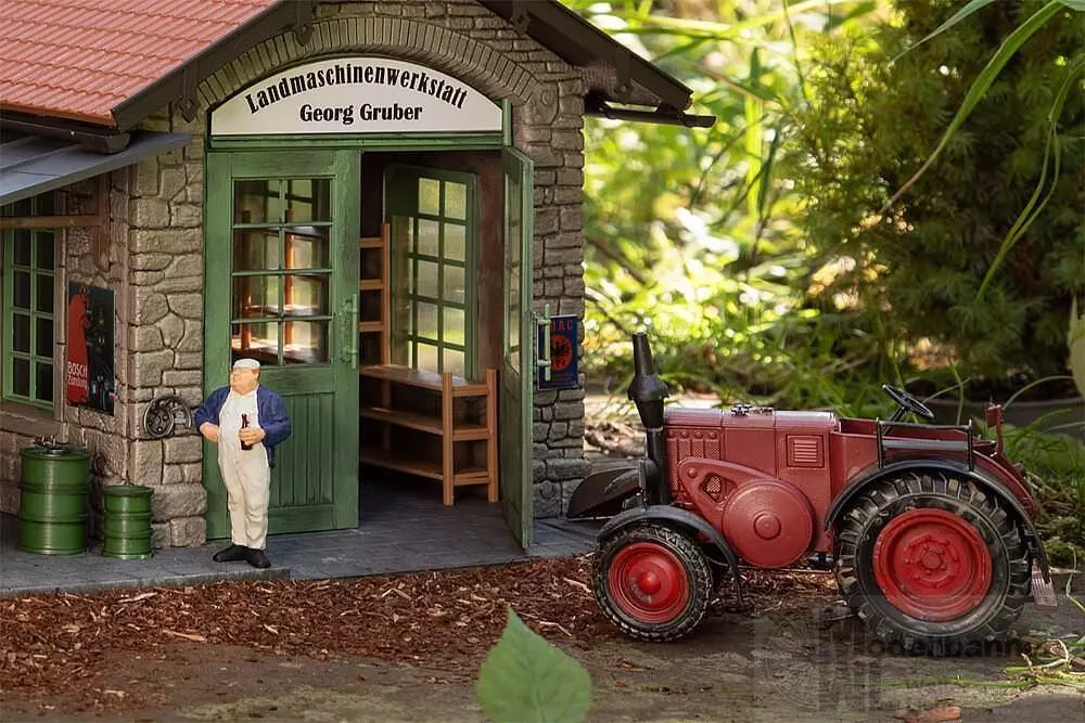 Passende Werkstattausstattung wie Werkzeug, Ölfässer, Amboss usw. liegen dem Bausatz bei. Maße (L x B x H): 498 x 385 x 300 mm Epoche: II