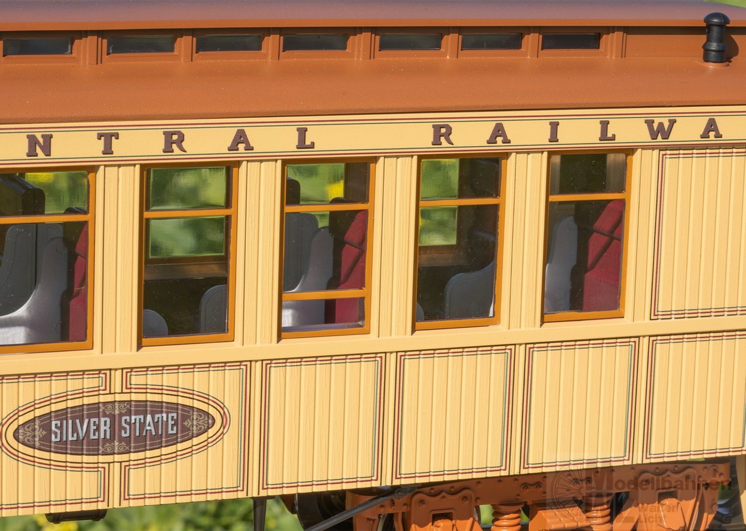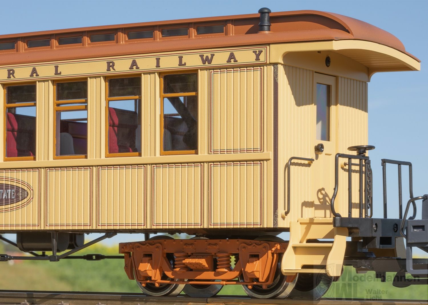 Modell eines typischen amerikanischen Oldtimer-Personenwagens in der Ausführung der Nevada Central Railroad, wie er damals bis in die 1930er Jahre im Einsatz war. Originalgetreue Farbgebung und Beschriftung der Epoche II. Türen zum Öffnen, vollständige Inneneinrichtung. Metallradsätze. Länge 49 cm.