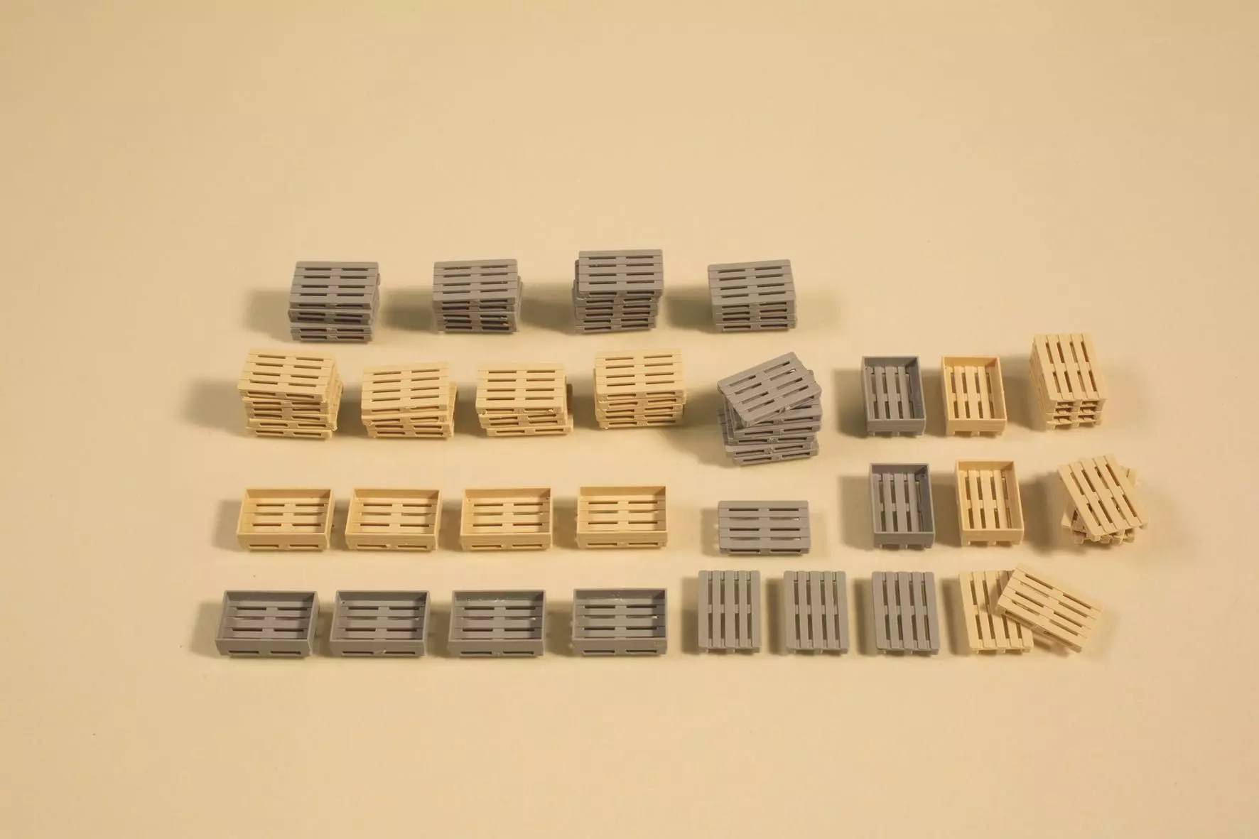 Mit den Europaletten lassen sich Fahrzeuge beladen, Ladeszenen darstellen oder große Palettenlager gestalten. In einer Packung sind 80 „normale“ Paletten und 16 Paletten mit Aufsatzrahmen in je zwei verschiedenen Versionen (neue und gebrauchte Paletten).