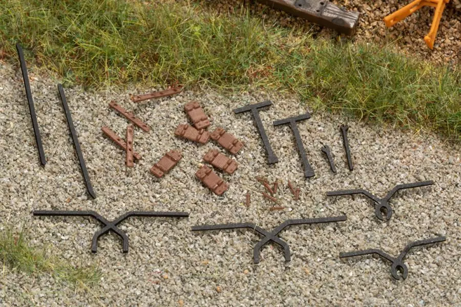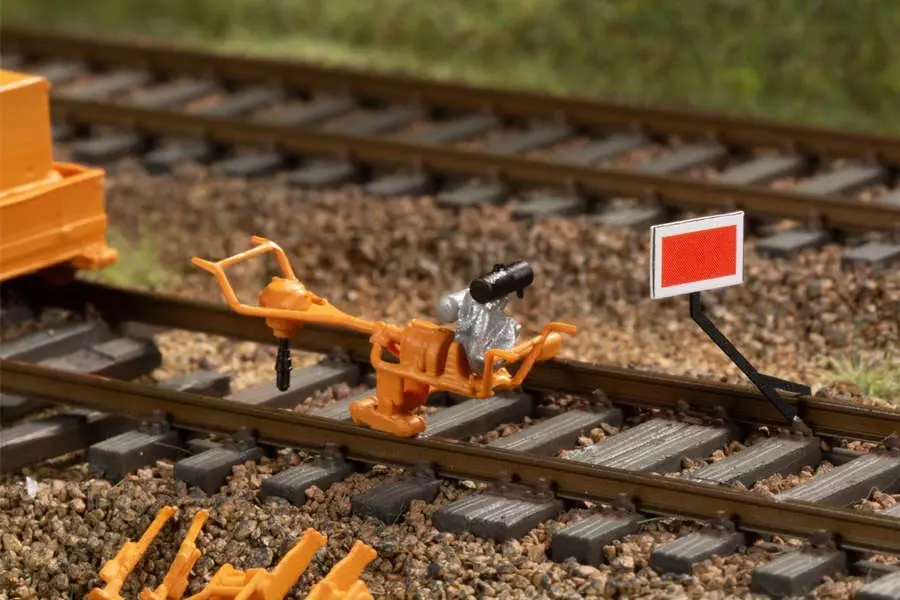 Durch die umfangreiche Werkzeug- und Materialausstattung ist das Gleisbau-Set die perfekte Ergänzung zum Thema „Bahnmeisterei“. Der kleine Rottenwagen transportiert den Stromgenerator sowie die Stromverteilung für die beiden Vibrostopfer. Eine filigrane Schraubmaschine, zwei Stockwinden, Schienen- und Schwellenzangen, Steck- und Laschenschlüssel und Brechstangen ergänzen den Bausatz. Beiliegende maßstäbliche Schwellenschrauben, Rippenplatten, Laschen und einzelne Holzschwellen