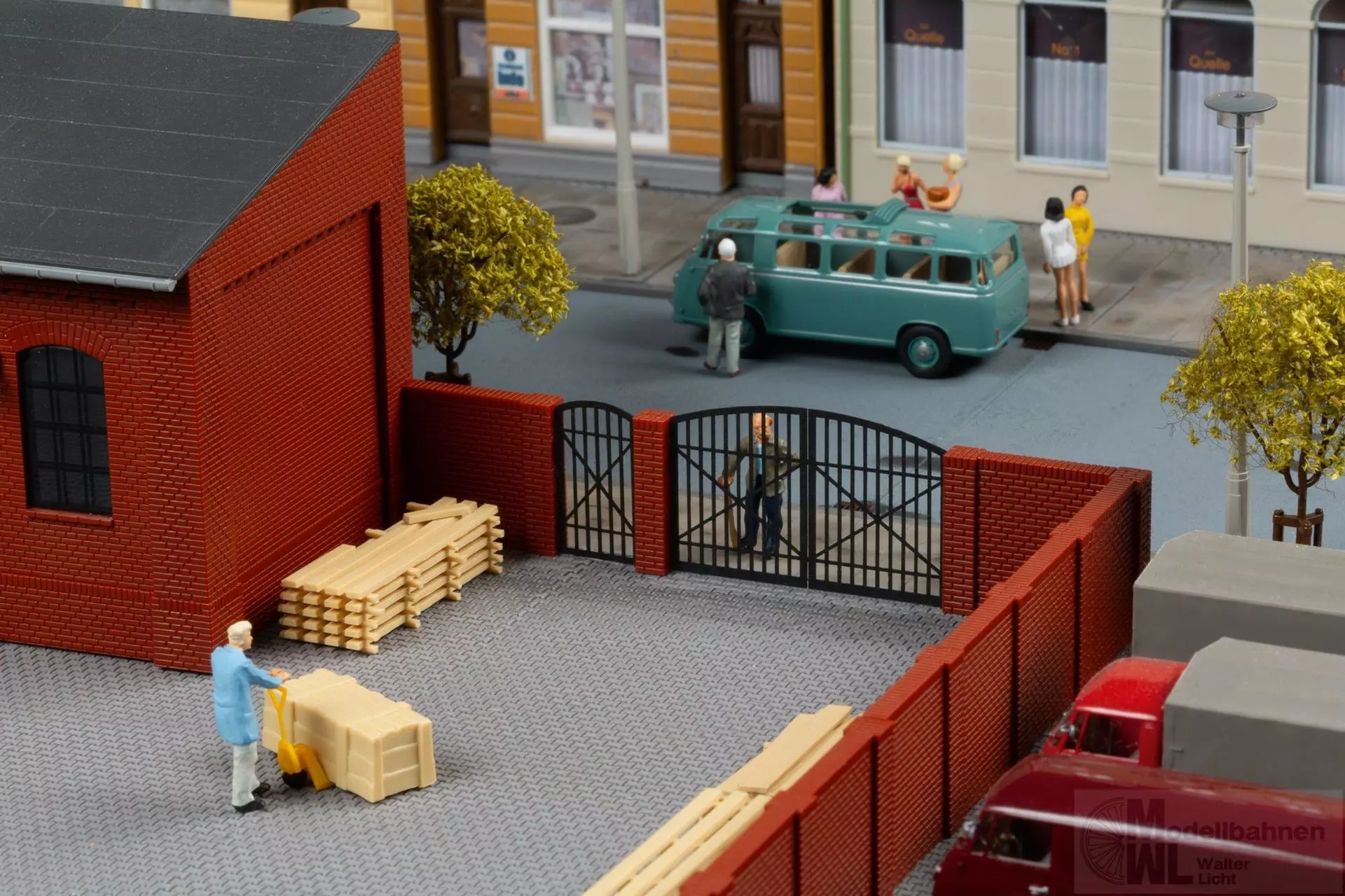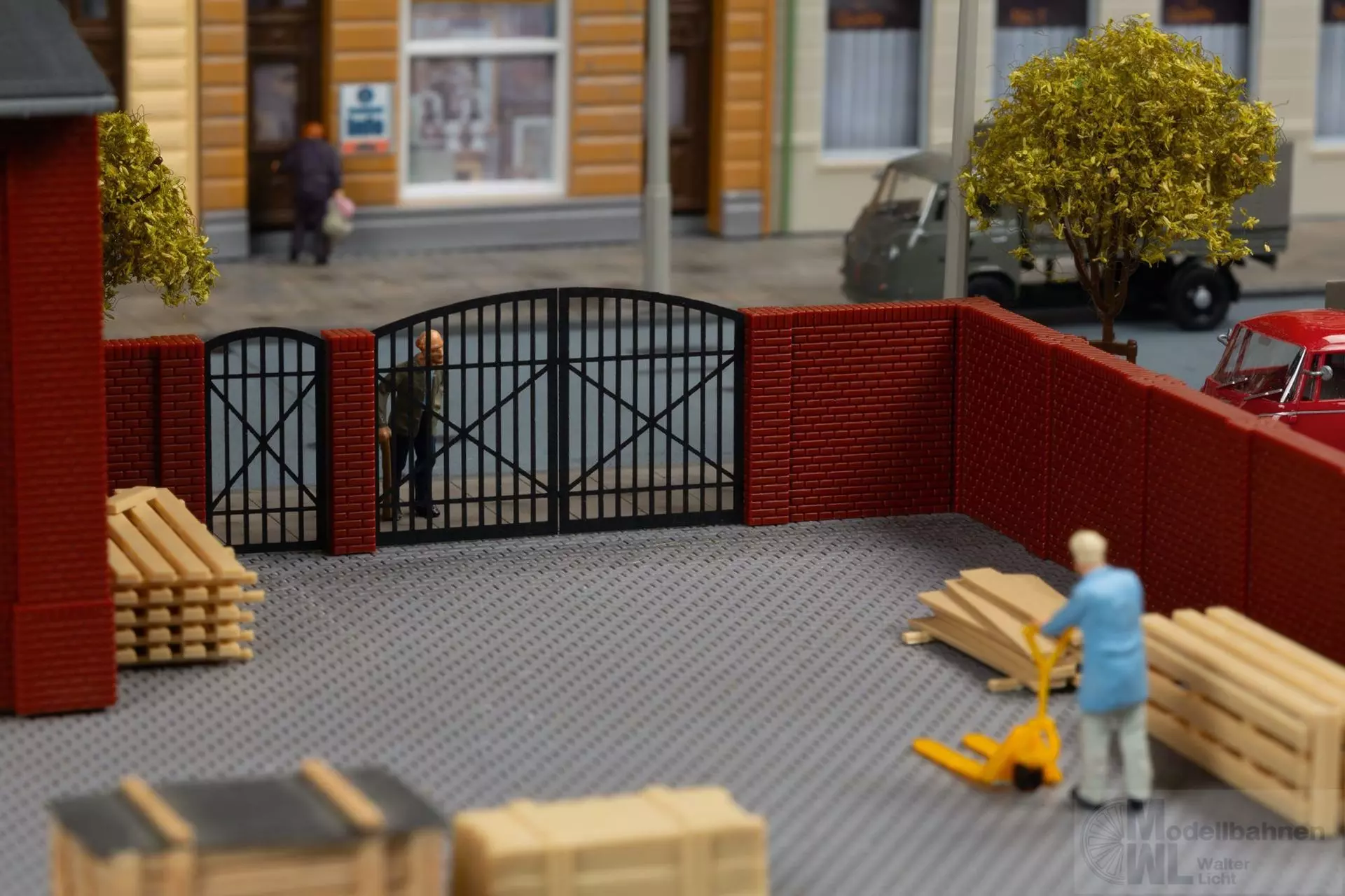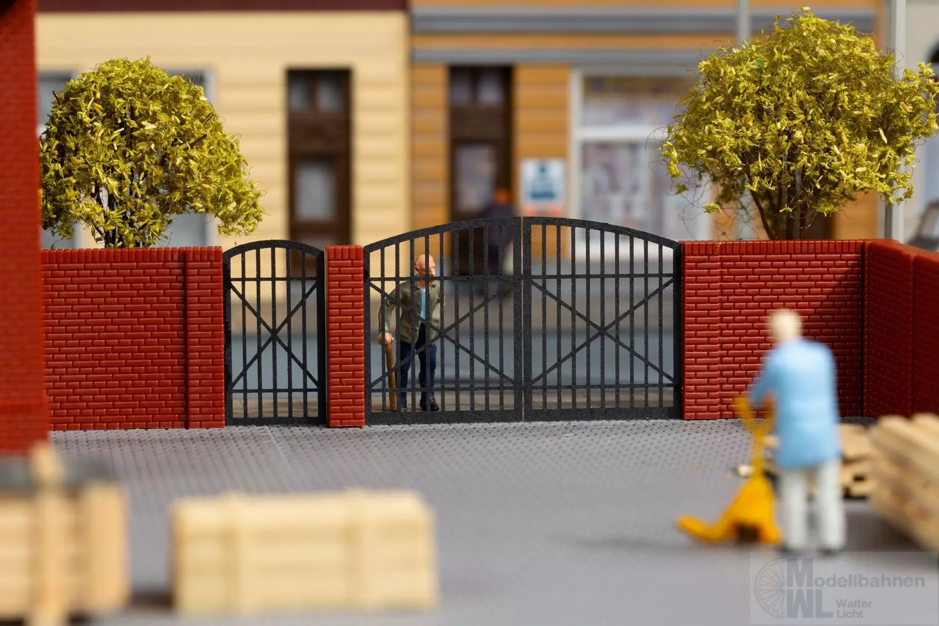 Mauern aus Klinkern sind eine stilvolle Art der Grundstücksumgrenzung. Das große Tor für Fahrzeuge, sowie das kleine für Fußgänger sind aus stabilem Lasercut- Karton gefertigt.