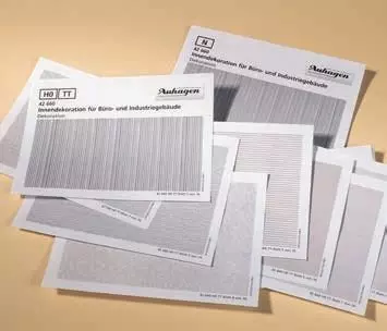 Eine große Auswahl an Druckbogen mit verschiedenen Mustern zur Dekoration von Fenstern und Türen, speziell für Büro- und Industriegebäuden. Die Packung enthält die maßstabsgetreuen Größen für H0, TT und N