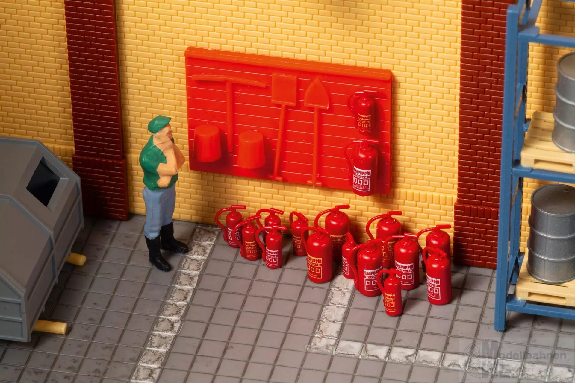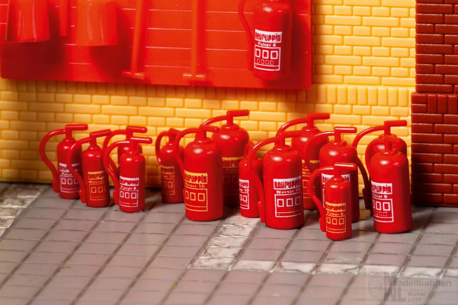 8 große und 8 kleine Handfeuerlöscher, weiß bzw. gelb bedruckt sowie eine Feuerlöschgerätetafel.