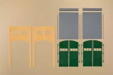 2 Wände mit Toröffnung L sowie Fensteröffnungen M ohne Zahnfries. 2 Holztore L, 2 Rolltore L.