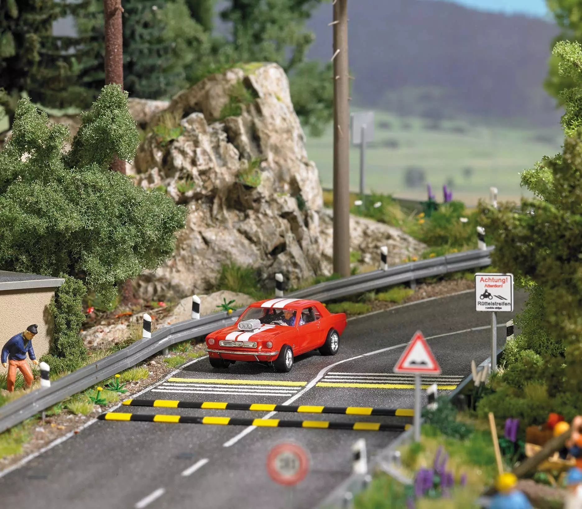 Rüttelstreifen und Bodenschwellen dienen im Original zur Geschwindigkeitsreduzierung durch Geräuschwarnung beim Überfahren. Das Set enthält 2 lange Bodenschwellen (alternativ als 4 kurze Bodenschwellen aufzubauen), 16 selbstklebende Rüttelstreifen und 10 Verkehrsschilder.