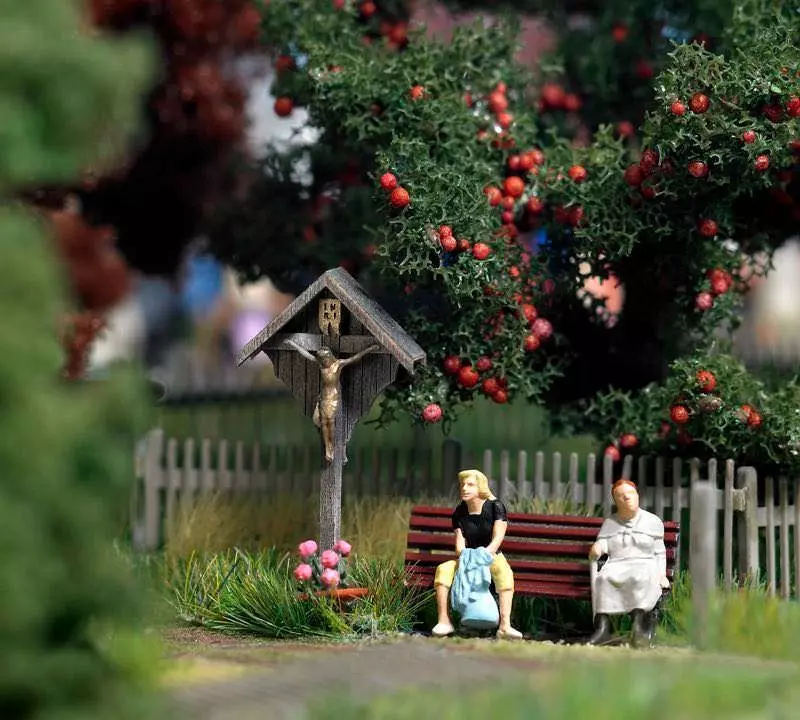 Nachbildung eines Weg- bzw. Flurkreuzes aus Holz. Besonders filigran ist die Nachbildung der geschnitzten Jesusfigur mit der vergoldeten Oberfläche (Kunststoff). Das Kreuz steht auf einem Steinsockel mit Blumenschmuck und Grablicht. Fertigmodell. Lieferung inkl. Sitzbank, Holzstapel, Steinfindling, Steinkreuz, Häschen und Jungfichte.