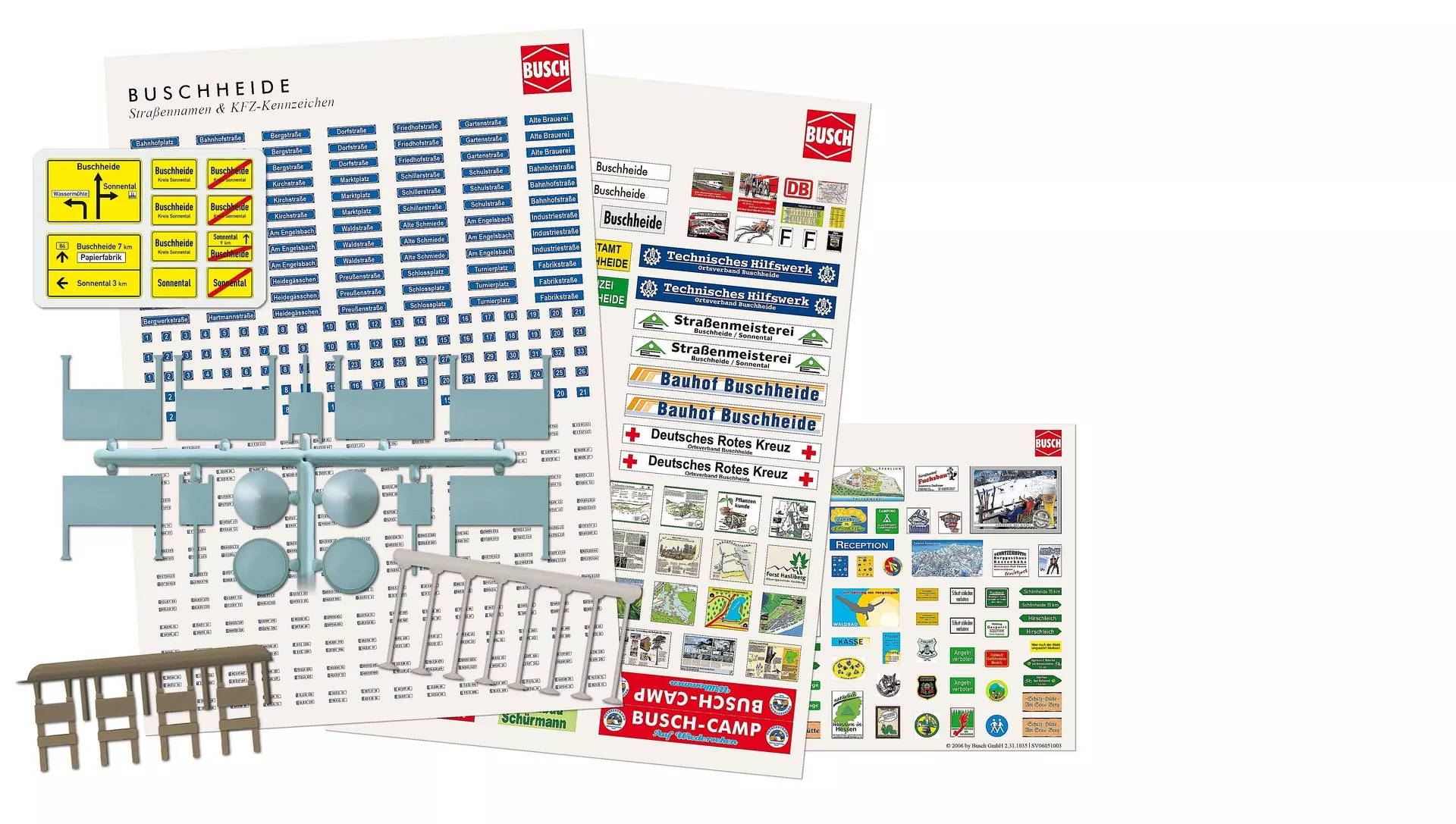 Schilder (vorgeschnitten) mit Masten und mehrere Ausschneidebogen mit Motiven und Schriftzügen passend zu Buschheide und Umgebung: Ortschilder, Straßennamen, Kfz-Kennzeichen, Veranstaltungsplakate, Werbeplakate, Wegweiser, Wirtshausschilder, Schilder für Bushaltestellen und zum Umbenennen u.a. folgender Gebäude: H0 1425 Stellwerk »Sigmaringen«, H0 1462 Bahnhof »Gunzen«, H0 1464 Haltepunkt »Aufhausen«, H0 1466/1467 Bahnsteige »Adorf« und H0 1468 Bahnhof »Kupferzell« usw.
