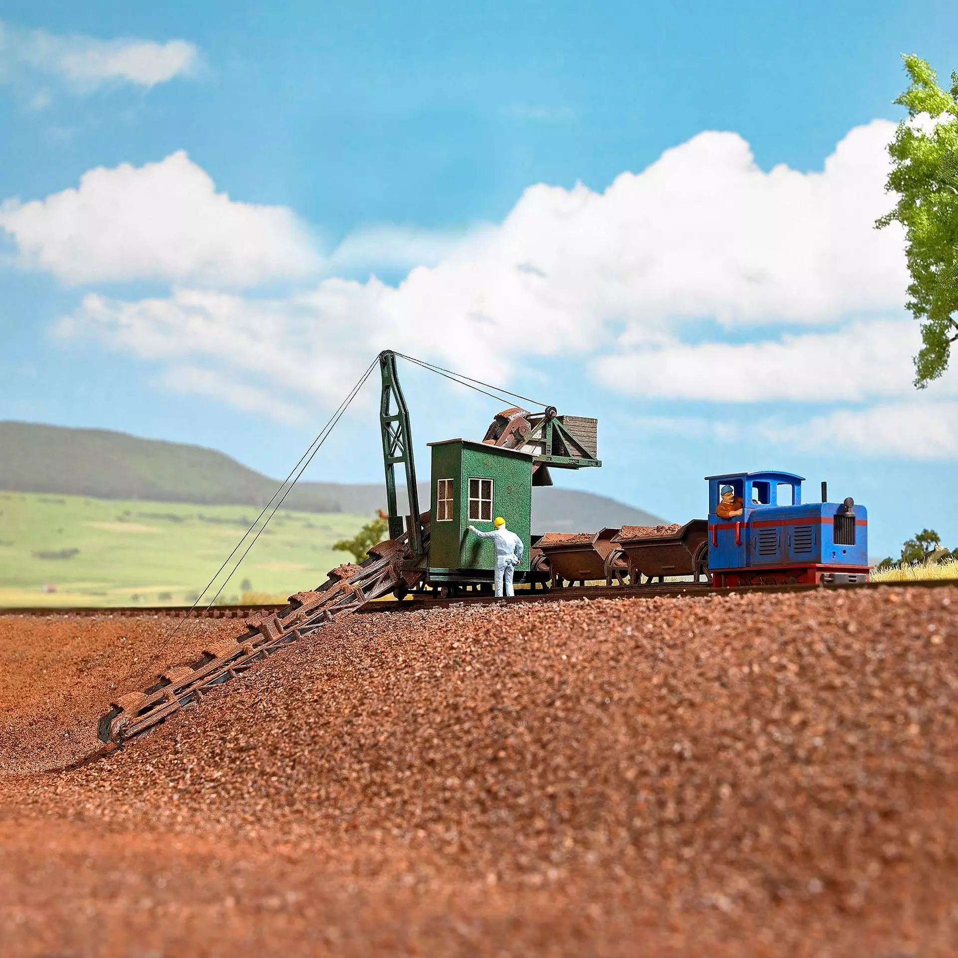 erfolgt auf handelsüblichen H0 Schienen ohne Bettung (nicht enthalten) mittels Metallachsen und Rädern unterhalb des Eimerkettenbaggers. Das Vorbild des Eimerkettenbaggers steht im »Ziegeleimuseum Erbs« in der Nähe von Leipzig. Bausatz. Größe: 140 mm x 32 mm, Höhe: 55mm.