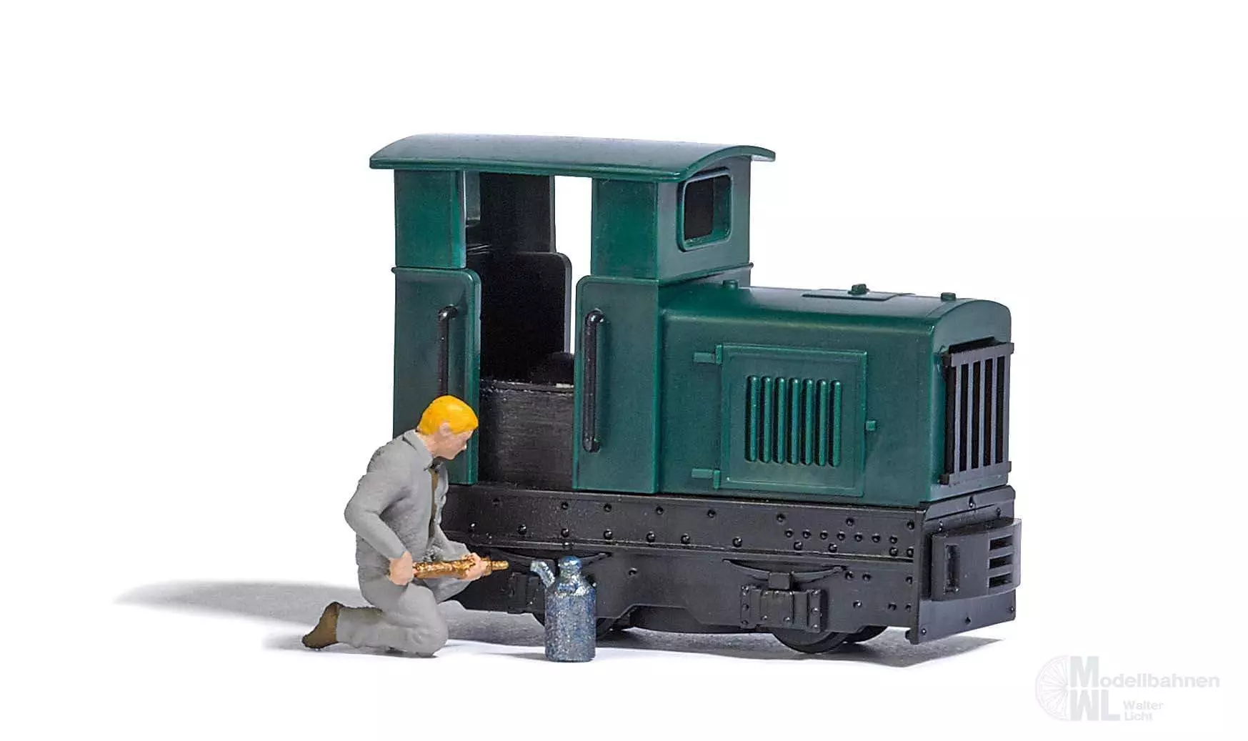 Fahrer, der seine Feldbahnlok ölt. Mit Gmeinder 15/18 mit geschlossenem Dach und Ölkanne. Standmodell ohne Antrieb. Achsfolge B. Länge: 36 mm.