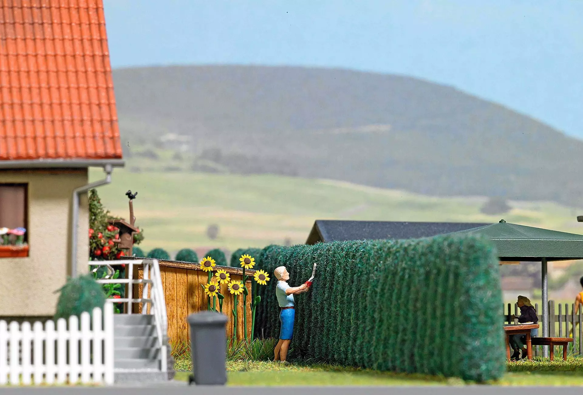 Thujen, auch »Lebensbäume« genannt, sind beliebte Heckenpflanzen im hauseigenen Garten und dienen oft als blickdichter Sichtschutz. In dem Set sind insgesamt 3 Reihen mit je 5 dicht aneinander stehenden sowie 12 frei stehenden Thujen enthalten. Fertigmodelle, bereits realistisch beflockt. Größen: 20 bis 30 mm.