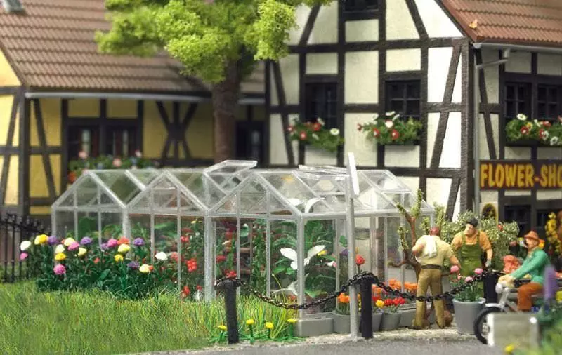 Bausatz für zwei Gewächshäuser in moderner Architektur. Mit großen Fensterflächen, Oberlichtern und Eingangstür. Inklusive Innenausstattung: Tische, Blumentöpfe und Eimer mit Besen. Hervorragende Ergänzung für die schönen und detaillierten Natur-Pur-Pflanzen von Busch. Größe (pro Gewächshaus): 40 x 25 mm, 31 mm hoch.
