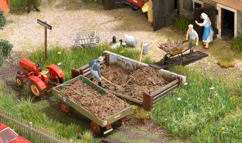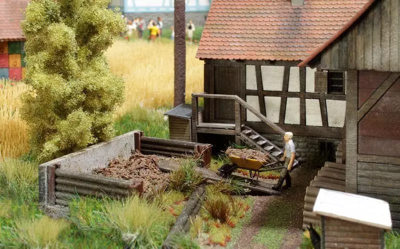 Bausatz für einen typisch ländlichen Misthaufen mit Beton-Grundplatte und Einfassung aus echtem Holz. Inkl. Streumaterial als »Füllung« und Zubehör wie Schubkarren, Rechen, Heugabel, Mistgabel und Sichel.