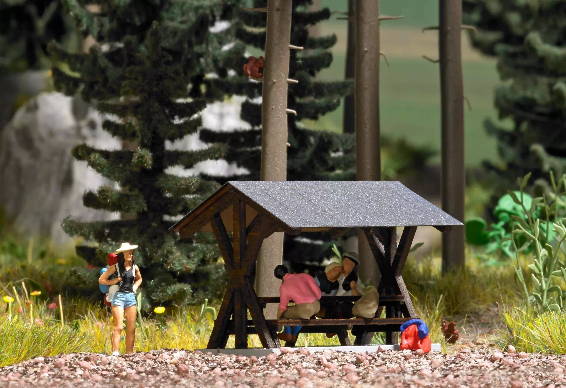 Bausatz für eine überdachte Sitzgruppe mit Tisch und Bänken aus echtem Holz, wie sie an Rastplätzen im Wald oder auch auf Raststätten zu finden ist. Alle Teile sind fertig koloriert.