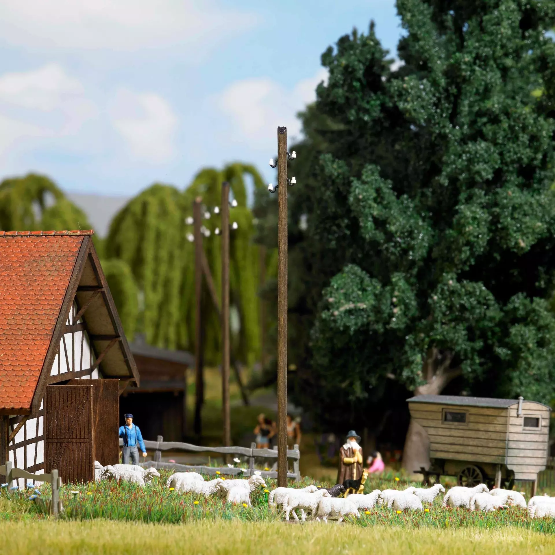 Bausatz für 5 Freileitungsmasten aus Echt-Holz mit filigranen Isolatoren. 4 Masten gerade, 1 Mast mit Seitenausleger. Höhe jeweils: 107 mm.