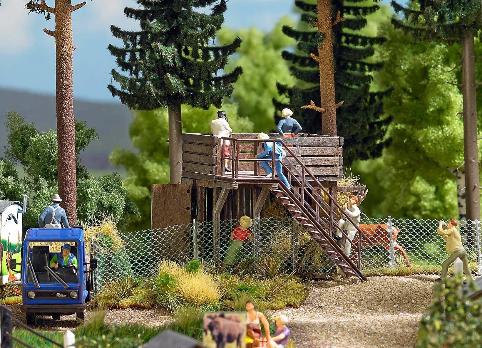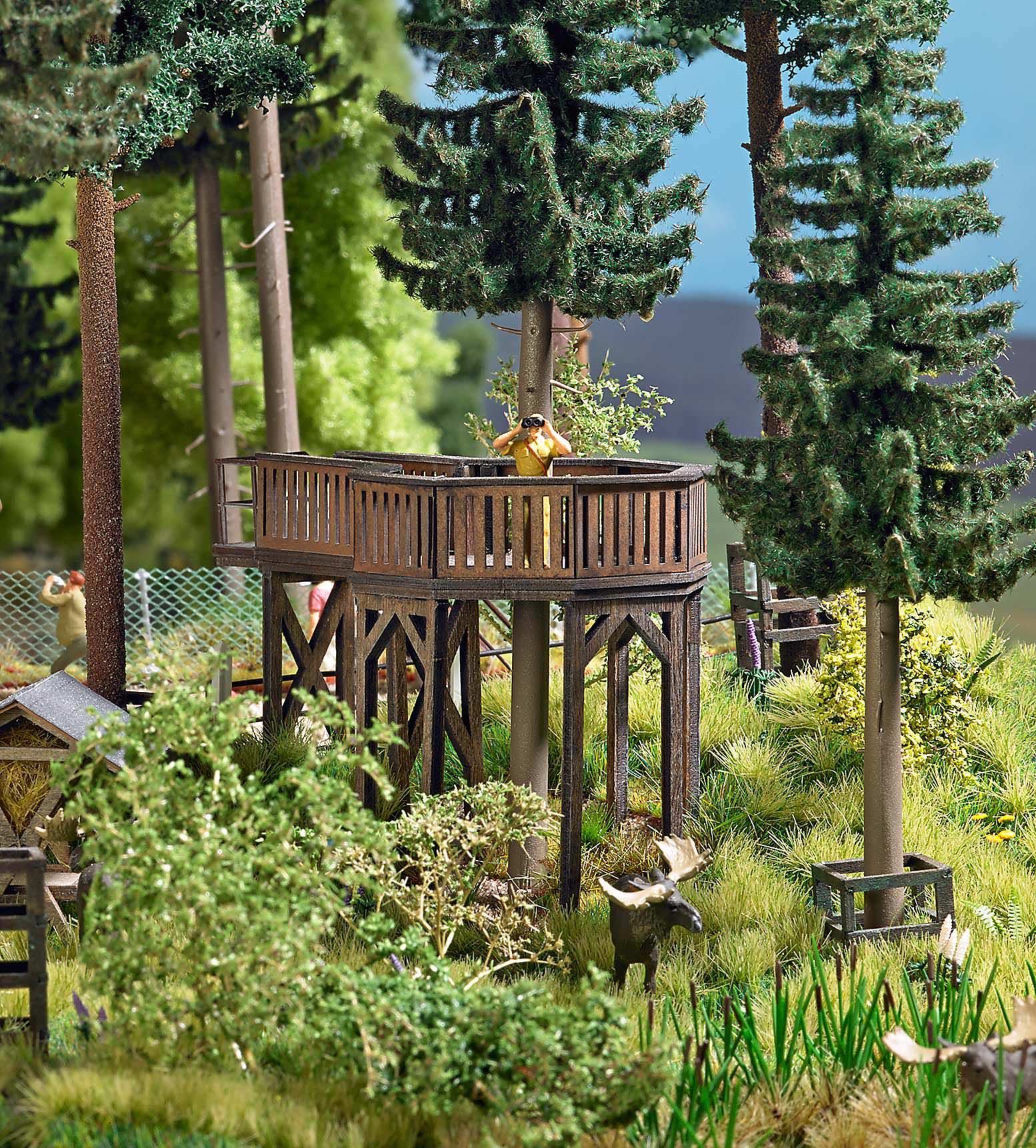 Echt-Holz Bausatz. Achteckige Aussichtsplattform (115 x 44 mm, 43 mm hoch) mit rundum laufendem Geländer, Aufgang mit Treppe und Aussparung im Boden mit »hindurchwachsender« Fichte (Fertigmodell, 170 mm hoch). Besucherterrasse (50 x 42 mm, 41 mm hoch) mit Treppenaufgang, integrierter Futterraufe und Tränke für die Wildfütterung. Tür zum Öffnen. Futterunterstand mit Giebeldach (52 x 28 mm, 33 mm hoch).