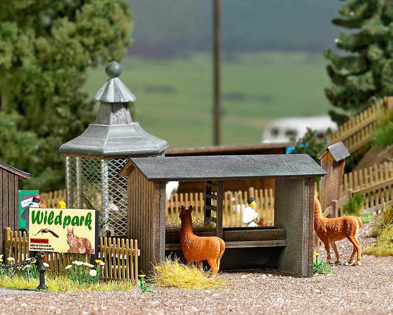 Die Vielfalt dieses Themas wird von Busch mit der Wildpark-Serie perfekt in Szene gesetzt. Die Gebäude und Zubehörartikel, vom Kassenhaus bis zum Wildpark Ausgestaltungs-Set, bieten heimatlichen und exotischen Tierarten gleichermaßen eine adäquate Behausung. Nahezu unendlich ist der Variantenreichtum, der sich für Modellbahnanlagen und im Dioramenbau bietet. Auch ein Vogelpark, ein kleiner Zoo oder Tierpark kann realistisch dargestellt werden.