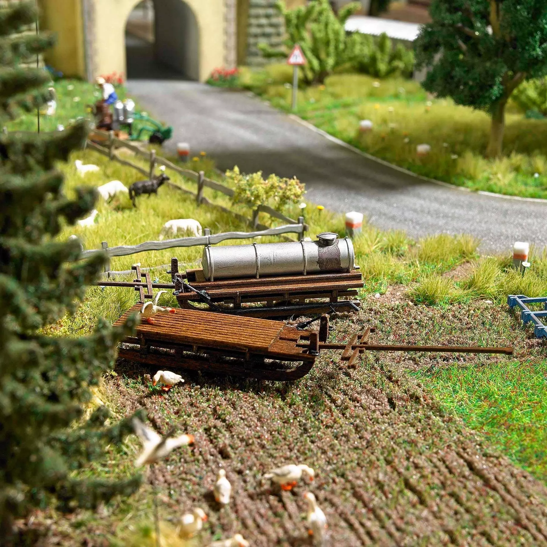Zwei Transportschlitten aus echtem Holz, bereits fertig koloriert. Superdetailliert mit Bremsanlage. Ein Schlitten mit Wasserfass. Bausatz.