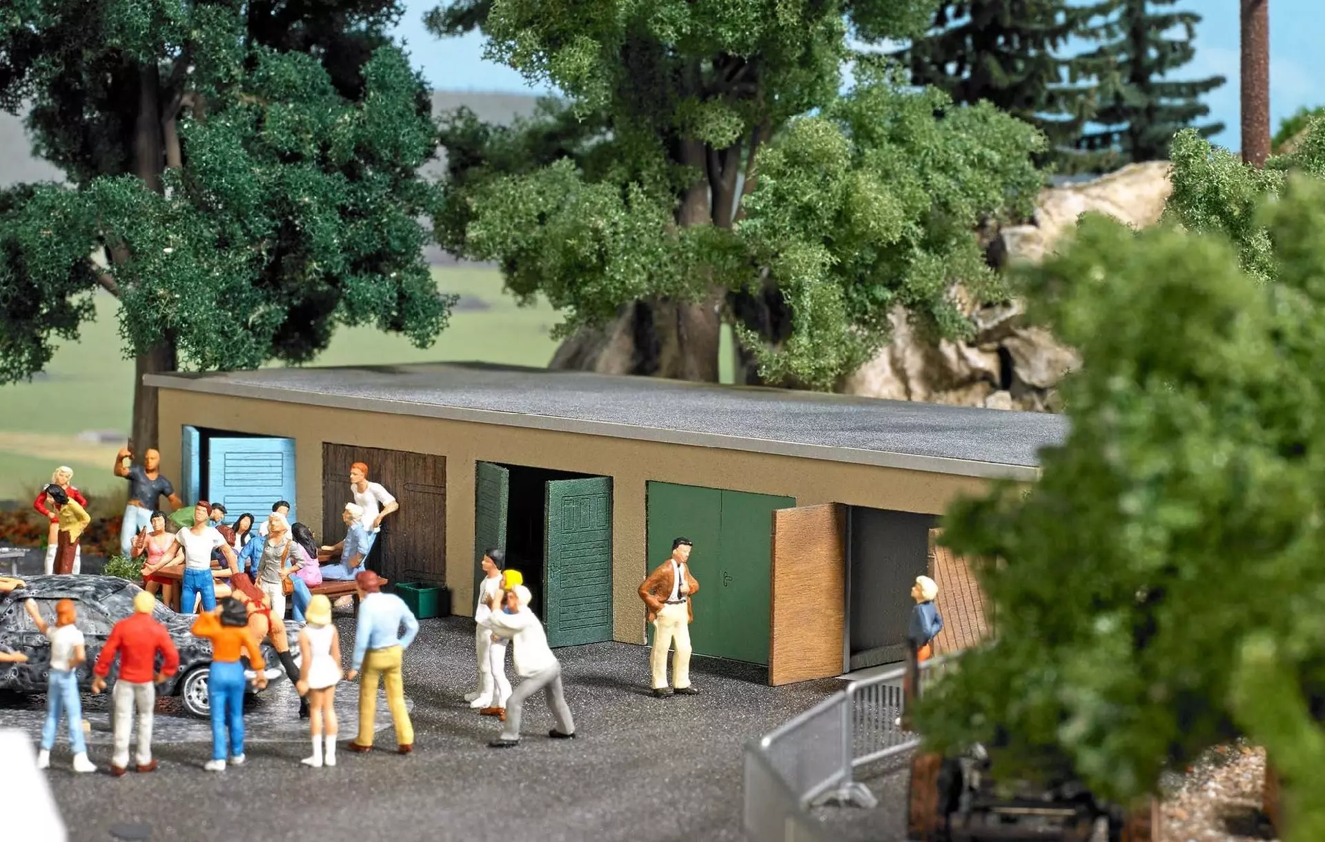 Bausatz für eine fünfständige Betongarage mit echten Holztoren, bereits fertig farbig koloriert.