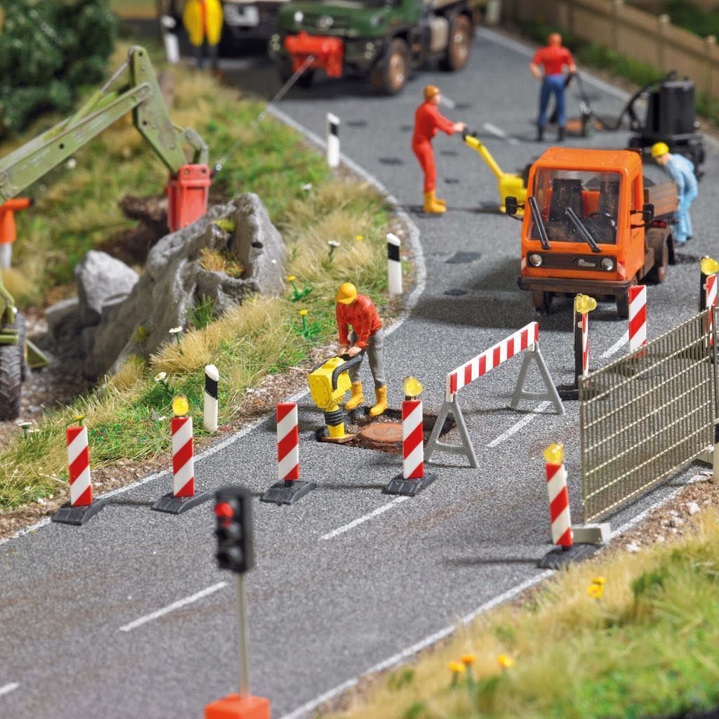 Mit Bauarbeiter, Absperrgitter, Hacke, Schaufel, Besen, Werkzeug und Eimer. Fertigmodell.