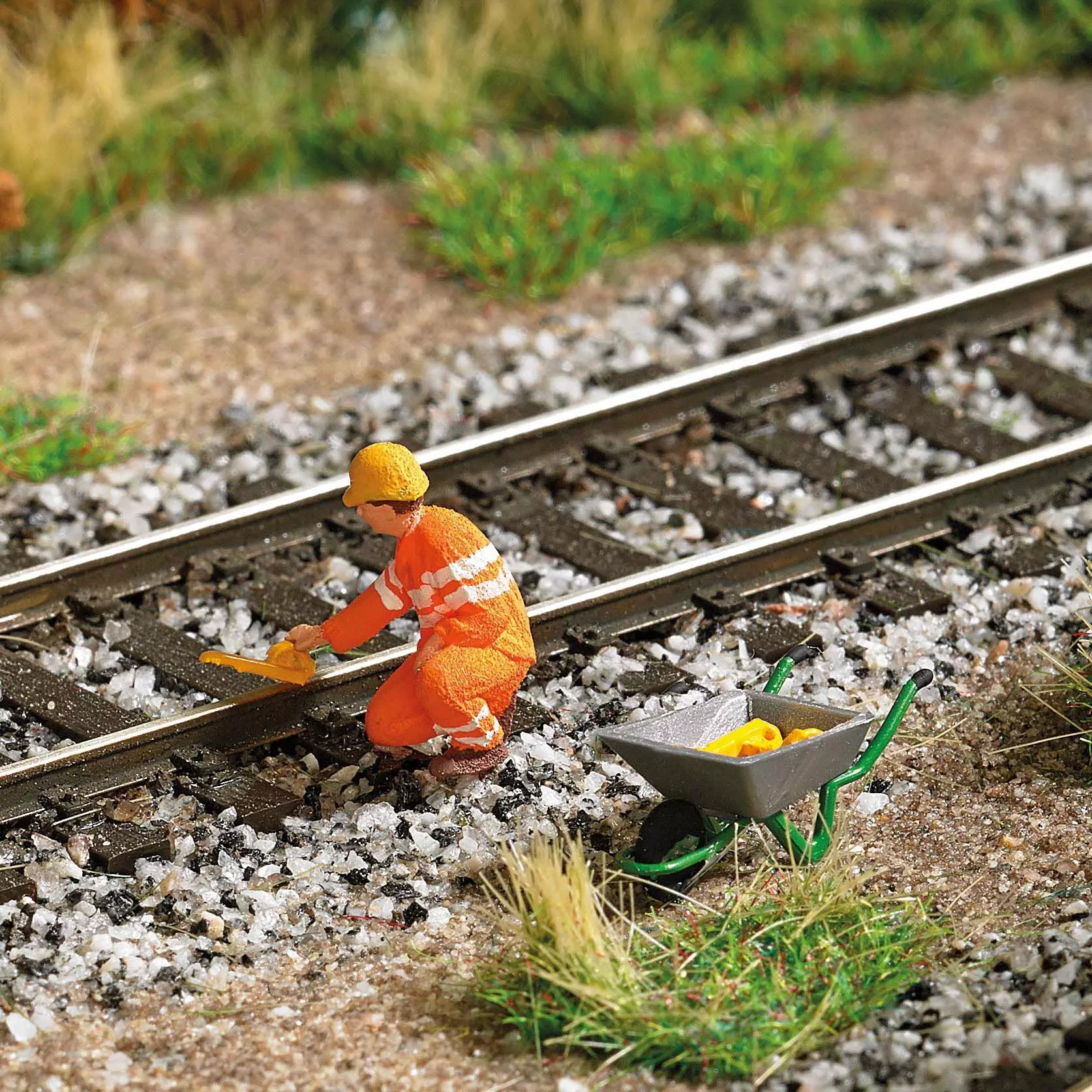 Mit dem Hemmschuh, auch Bremsschuh oder Radschuh genannt, werden Schienenfahrzeuge abgebremst. In diesem Set sind ein Bahnarbeiter als Hemmschuhleger, weitere Hemmschuhe und ein Schubkarren zum Transport enthalten.