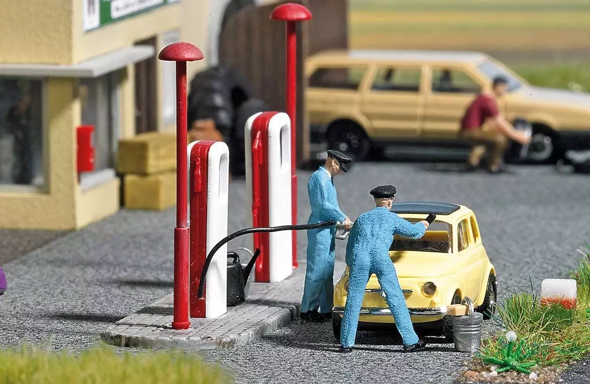 Fiat 500, Kanne, Eimer, Schwamm und 2 Tankwart-Figuren. Action Set für die realistische Belebung Ihrer Modellwelt.