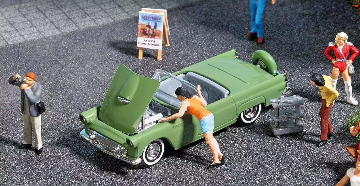 Action Set für die realistische Belebung Ihrer Modellwelt. 1950er Jahre Ford Thunderbird Cabrio mit geöffneter Motorhaube und Motorennachbildung. Mit Figur.