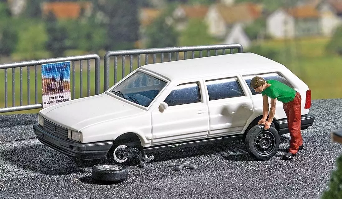 Action Set für die realistische Belebung Ihrer Modellwelt. Mit VW-Passat Kombi, Ersatzrad, Wagenheber, Radkreuz und Warndreieck für die realistische Reifenpanne mit Radwechsel inkl. Figur.