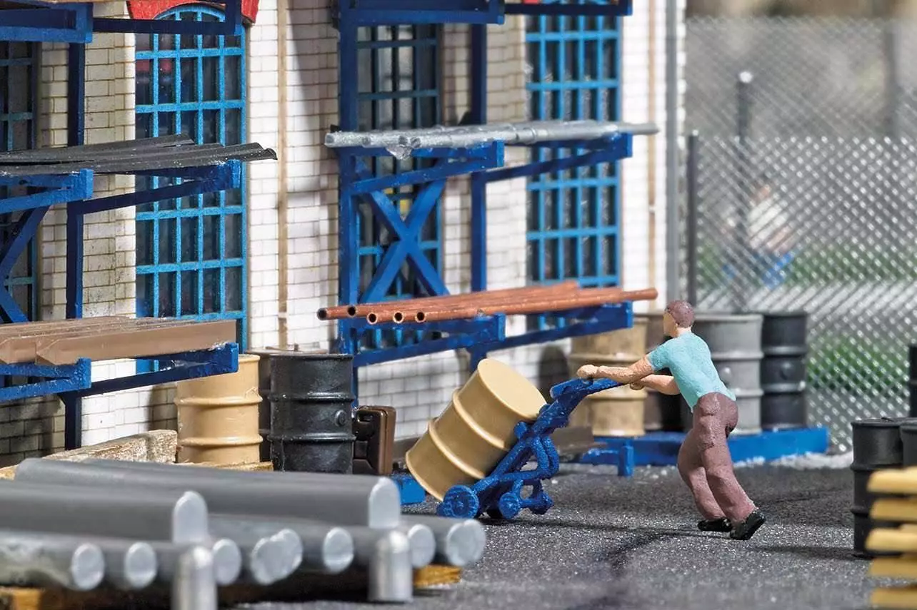 Action Set für die realistische Belebung Ihrer Modellwelt. Spezieller Fasstransportwagen mit 9 Fässern, Ölauffangwannen und Arbeiter.