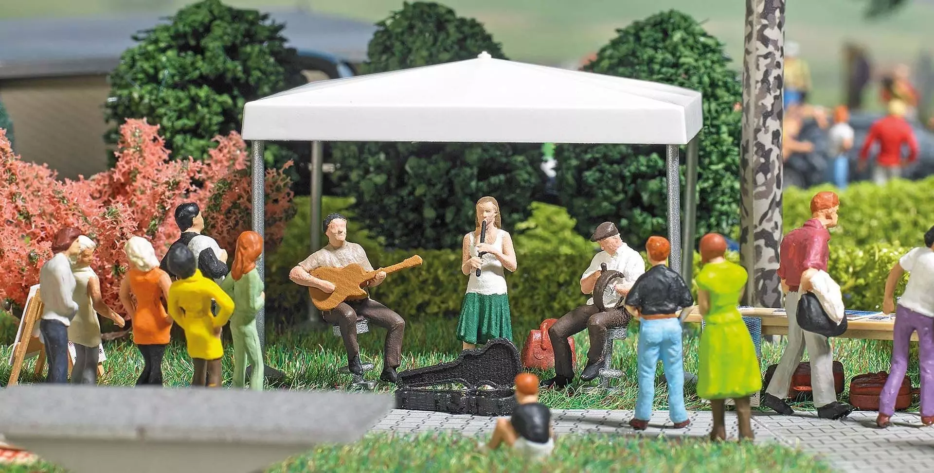 Action Set für die realistische Belebung Ihrer Modellwelt. Diese Straßenmusikanten überzeugen nicht nur mit ihrer irischen Folkloremusik. Nebenbei wird auch noch für ihre musikalische Heimat, der »Grünen Insel«, Werbung gemacht. Mit 3 Musikanten, Gitarrenkasten, Werbeaufstellern, Pavillonzelt, Tisch, Werbeflyern, CDs sowie Reisegepäck.