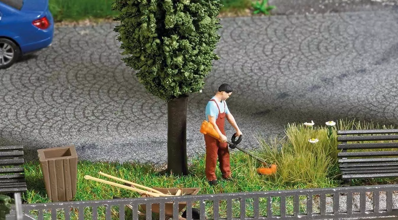 Action Set für die realistische Belebung Ihrer Modellwelt. Landschaftsgärtner mit Rasentrimmer und weiteren Gerätschaften: Schubkarren, Werkzeug und Benzinkanister. Mit Parkbänken, Abfallkorb und 3 Parkbäumen (120 mm hoch).