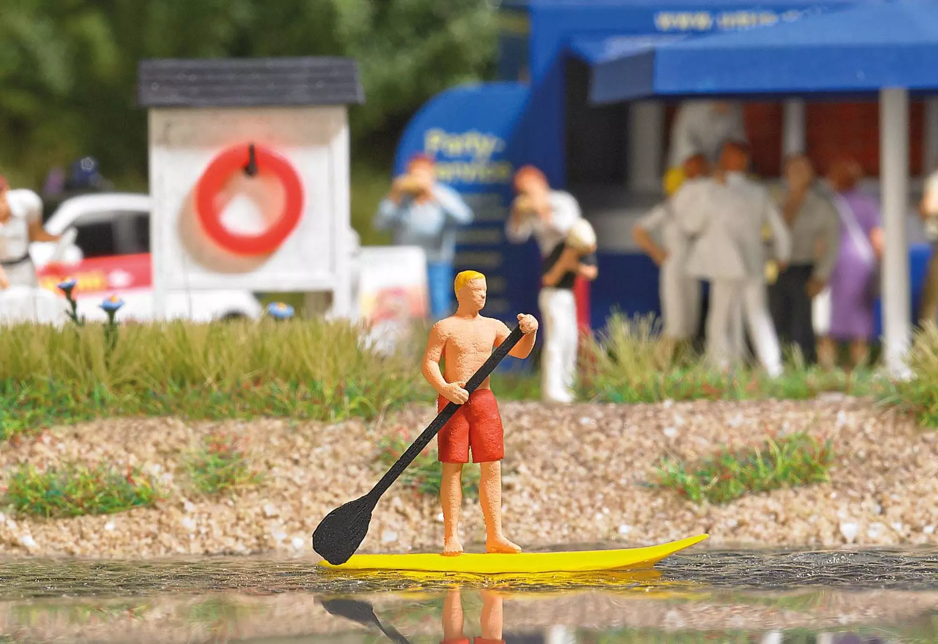 Bei dieser weltweit am schnellsten wachsenden Trendsportart steht der Sportler aufrecht auf einem schwimmfähigen Board und bewegt sich durch Paddeln mit einem Stechpaddel vorwärts. Der Wassersportler und sein Sportgerät sind in diesem Modell detailliert dargestellt.