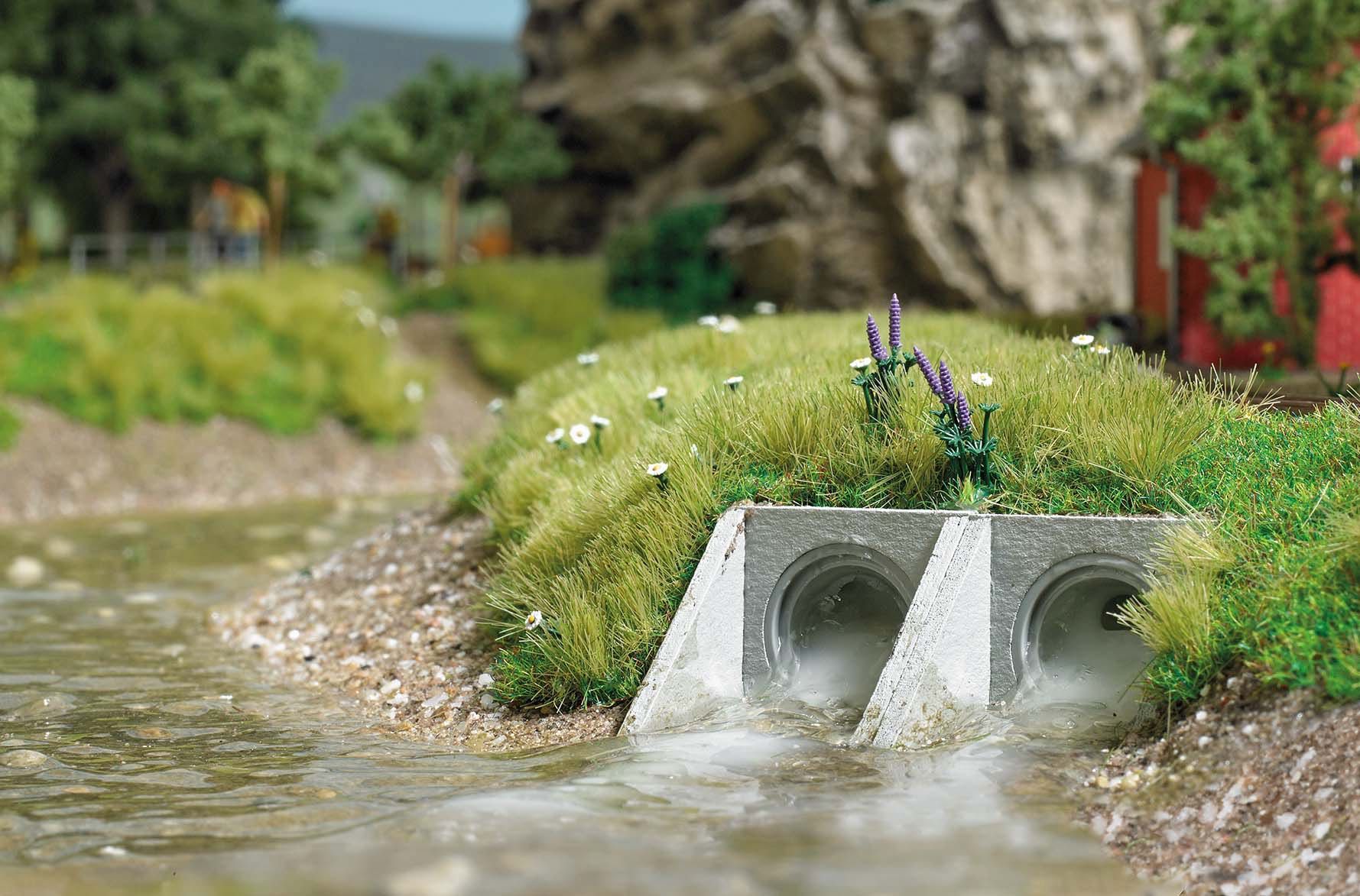 Bausatz für 2 Gewässerdurchlässe, bestehend aus Betonröhre mit Einfassung. Zum Einsatz in Straßen- und Gehwegböschungen, in Bahndämmen und als Zulauf zu Bächen, Teichen usw. Größe jeweils: 49 x 24 mm, Höhe: 22 mm.