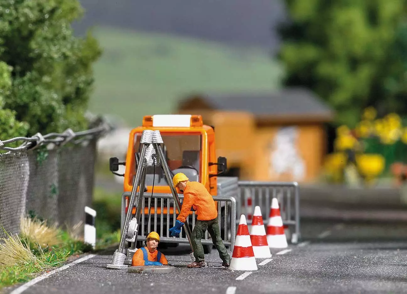 Action Set für die realistische Belebung Ihrer Modellwelt. Zwei Kanalarbeiter mit Dreibock samt Sicherungsgerät, Kanaldeckel und Absperrungen.