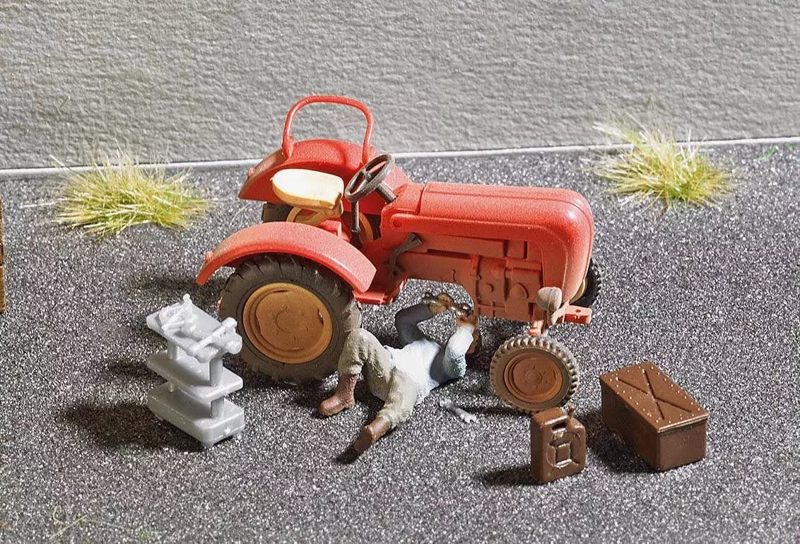 Action Set für die realistische Belebung Ihrer Modellwelt. Monteur, der unter dem Traktor liegend eine Reparatur ausführt. Mit Traktor, Werkzeugwagen, Werkzeugkiste, Werkzeug und Kanister.
