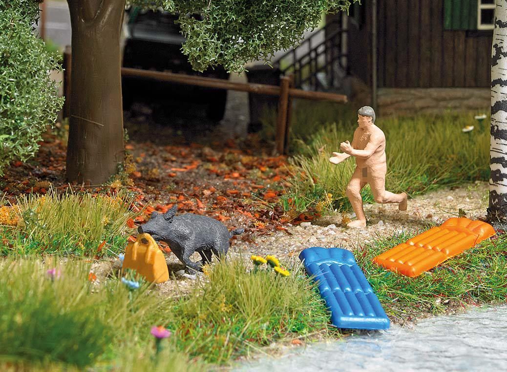 Action Set für die realistische Belebung Ihrer Modellwelt. Nackter Mann verfolgt ein Wildschwein, das seine Tasche gestohlen hat. Nach einer wahren Begebenheit am Berliner Teufelssee. Mit 2 Luftmatratzen.