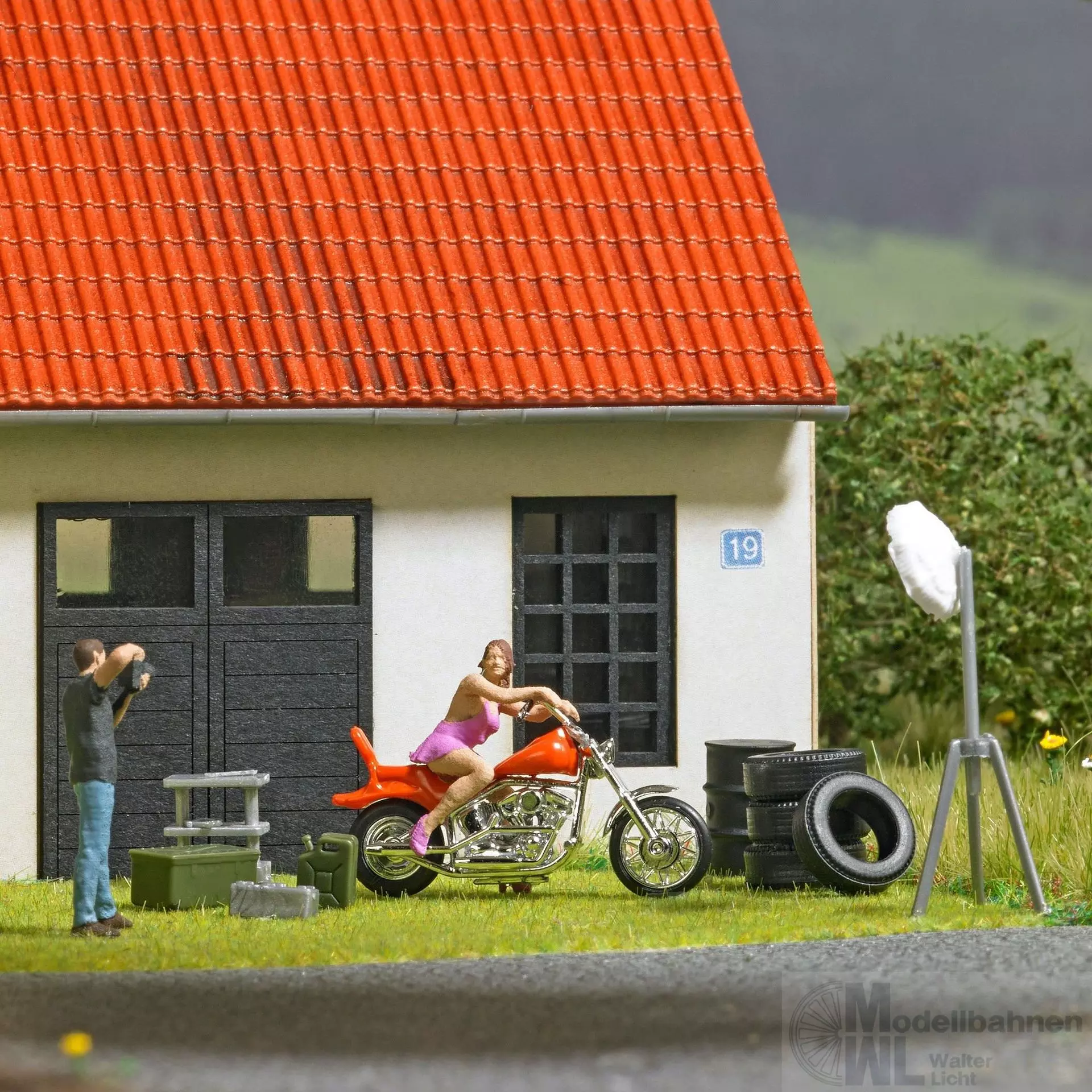 Chopper mit »heißer Motorradbraut« und Zubehör: Werkzeugkiste, Werkzeugwagen, Kanister, Reifen und Ölfass. Auch für Foto-Shootings geeignet, passende Fotografen: H0 79810