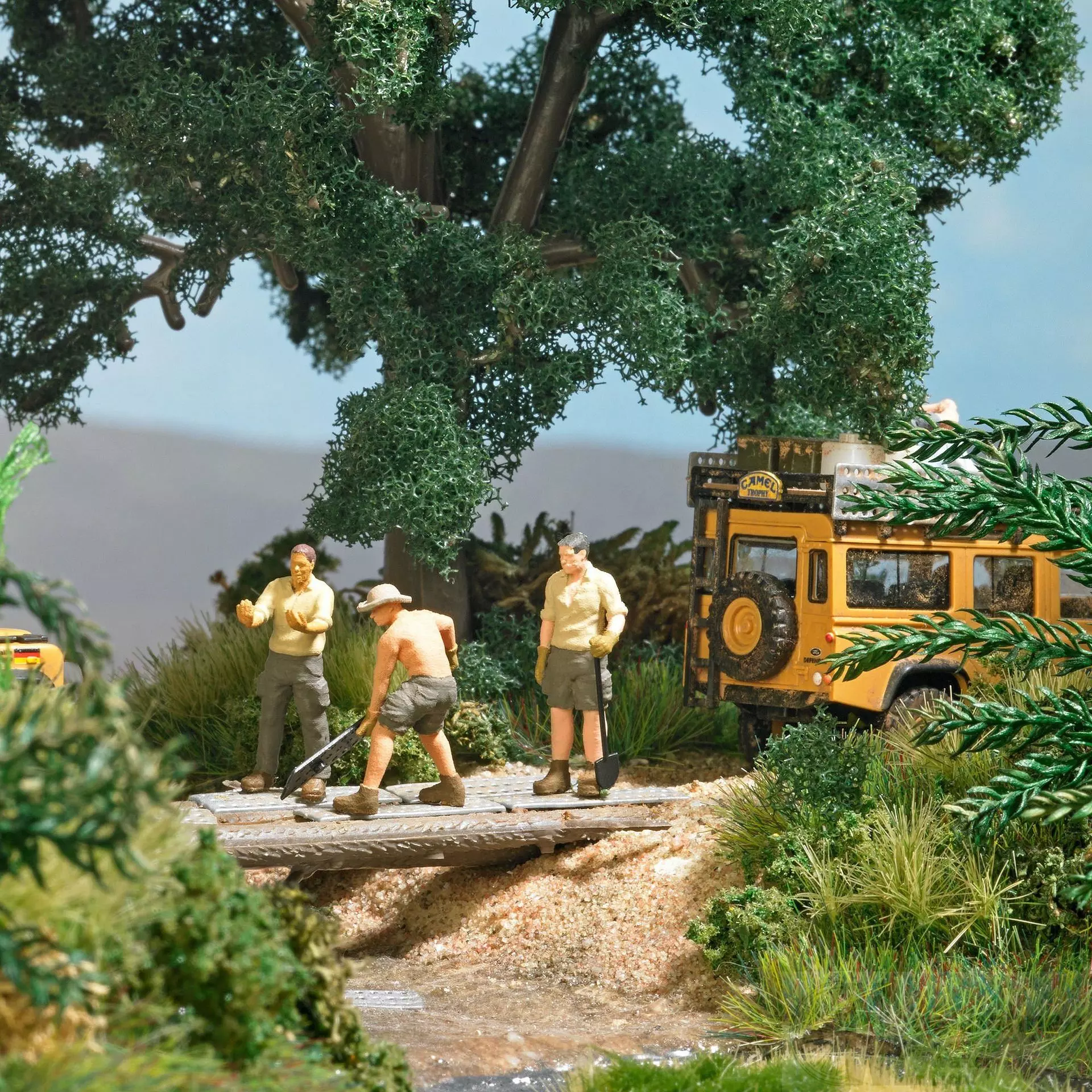 3 Teamworker, die den Trail für eine anspruchsvolle Offroad-Fahrt vorbereiten. Mit 4 Baumstämmen, Werkzeugen und jeweils 6 Kanistern, Werkzeugkisten und Sandblechen.